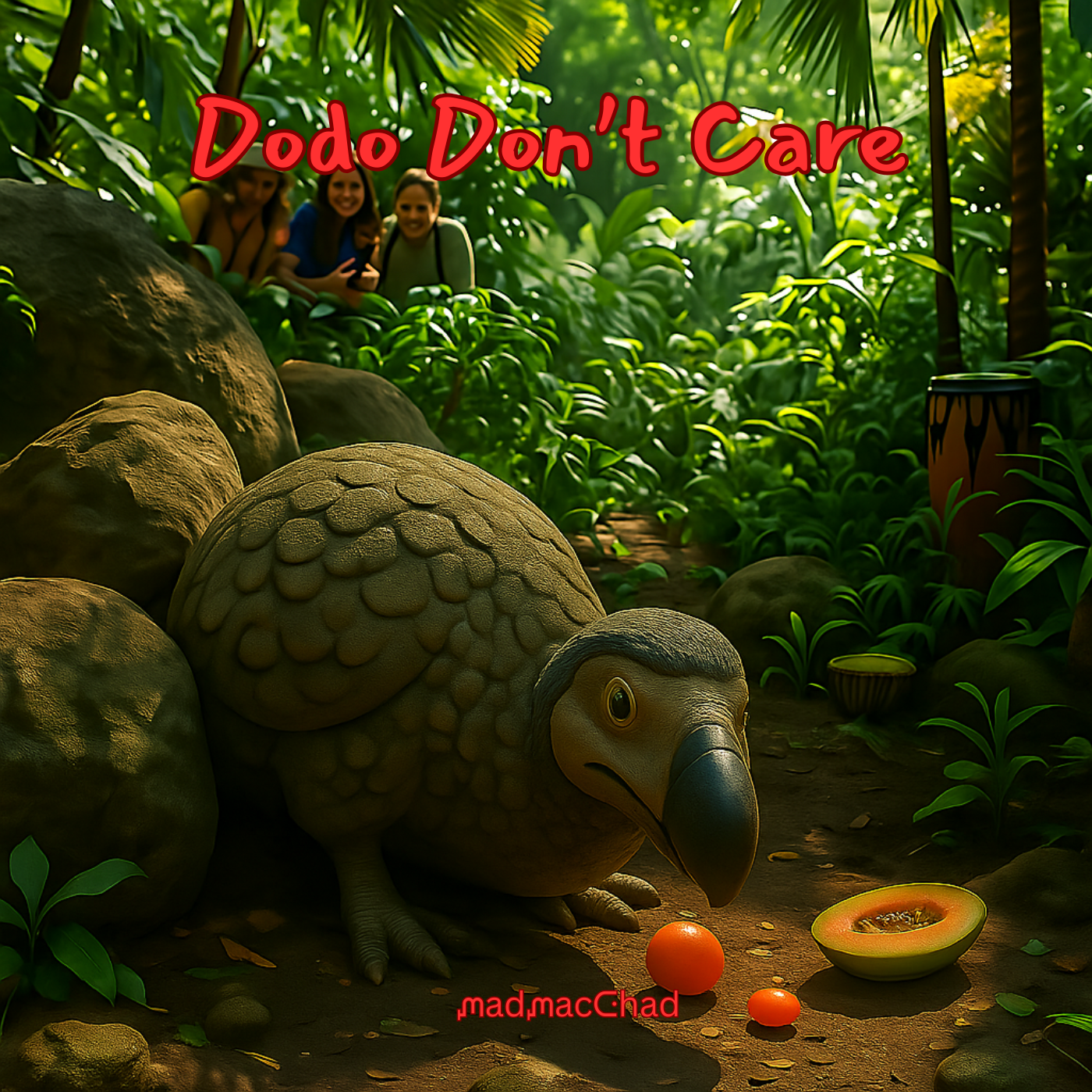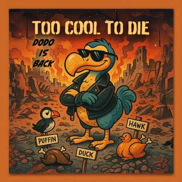 [Visuals: Dodos mit Lederjacken, Sonnenbrillen, Gitarren, Headbanging im Dschungel]