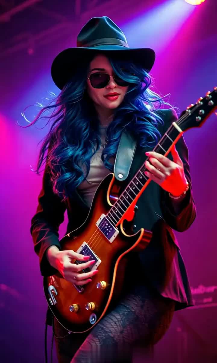 Hard rock, gritty female vocals, extended electric guitar solo, The solo melodic phrasing, aggressive bends, dramatic arc, 80s glam-metal soloing
