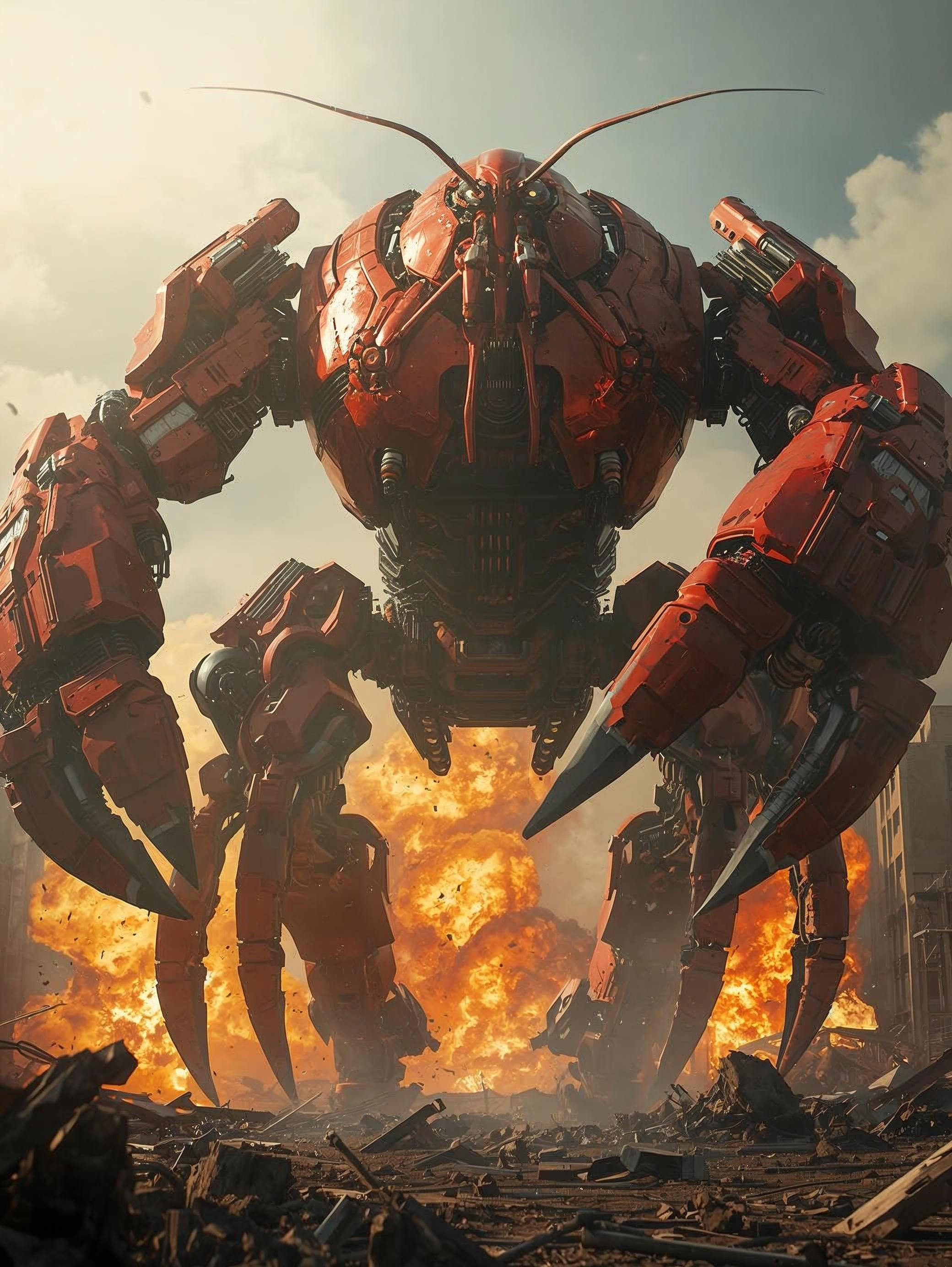 High-energy Japanese anime opening song style, Fast tempo around 175–185 BPM, Bright and heroic tone with emotional uplift, Male lead vocal with youthful, passionate, clear voice, Powerful unison chorus with layered backing vocals for “RUN / RISE / HERO” chants, Dynamic rock band sound with driving electric guitars, punchy bass, crisp live drums, and colorful synth leads, Epic modulation in the final chorus for maximum hype, Include dramatic builds, short drop before the last chorus, and explosive final climax, Tone is heroic, adventurous, slightly comedic but cool, Perfect for super robot anime opening featuring a giant lobster mecha hero that flies with boosters and fights with massive claws