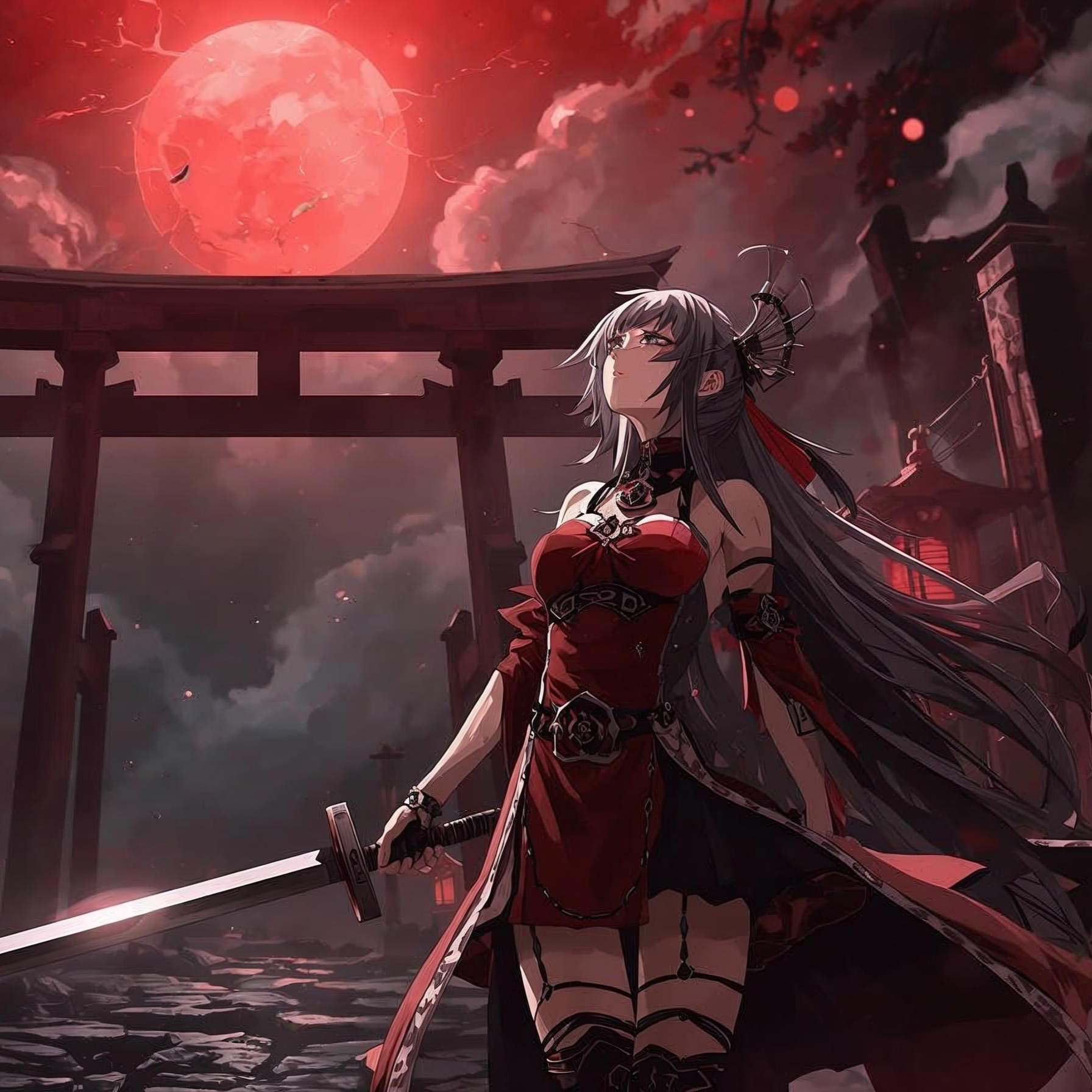 Fast Japanese mythological symphonic anime opening around 125–130 BPM, Vocals: Female Japanese vocal with strong attack and urgency, Use powerful string orchestra, harp arpeggios, taiko drums, sleigh bells, koto, shakuhachi flute, ritual bells and ethnic percussion, Light distorted guitar can appear in the chorus to maintain anime opening energy, The song begins quietly with harp, bells and soft strings near a shrine at night, Tension gradually builds with rhythm and orchestral layers, In the middle, a sacred bell rings violently at a torii gate and the music suddenly explodes, representing the jump from modern Japan into a mythological world filled with ancient spirits and monsters, After the transition the sound becomes epic, mystical and energetic with oriental minor scale melodies and dramatic orchestral power