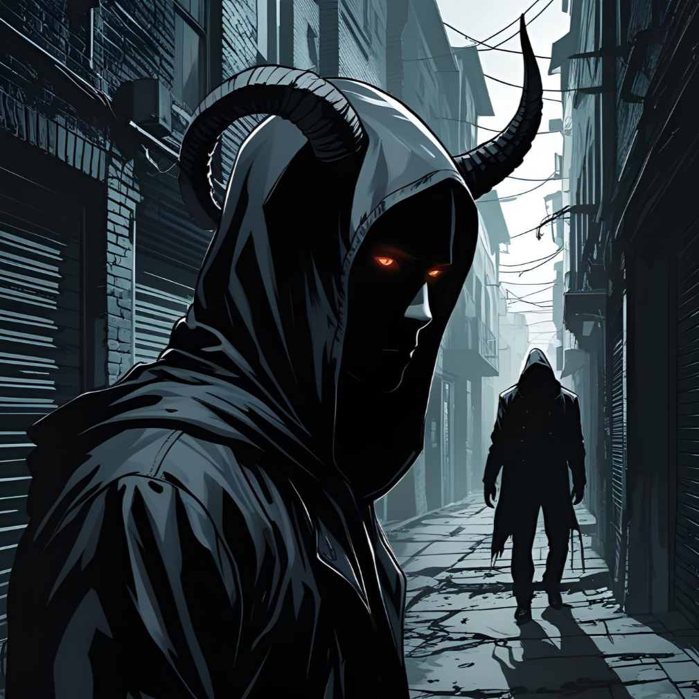Dark cinematic trap beat, eerie piano, dissonant strings, deep bass, Aggressive hi-hats, hard-hitting 808s, fast Spoken, tension builds, haunting echoes, sinister whispers, dramatic climax, story telling