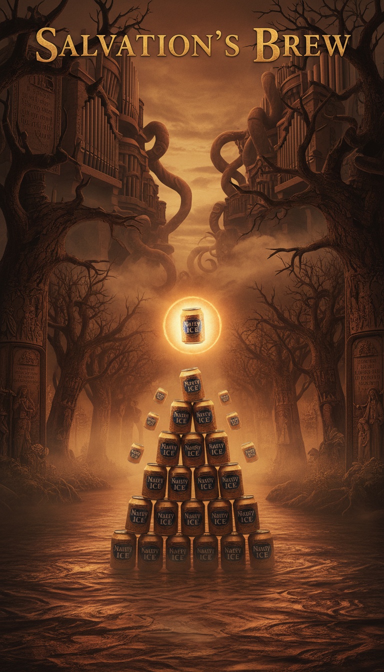 Sinister rap rock blend, slow-burning diss track with cold clarity, Natty Ice as salvation, dark cultural satire