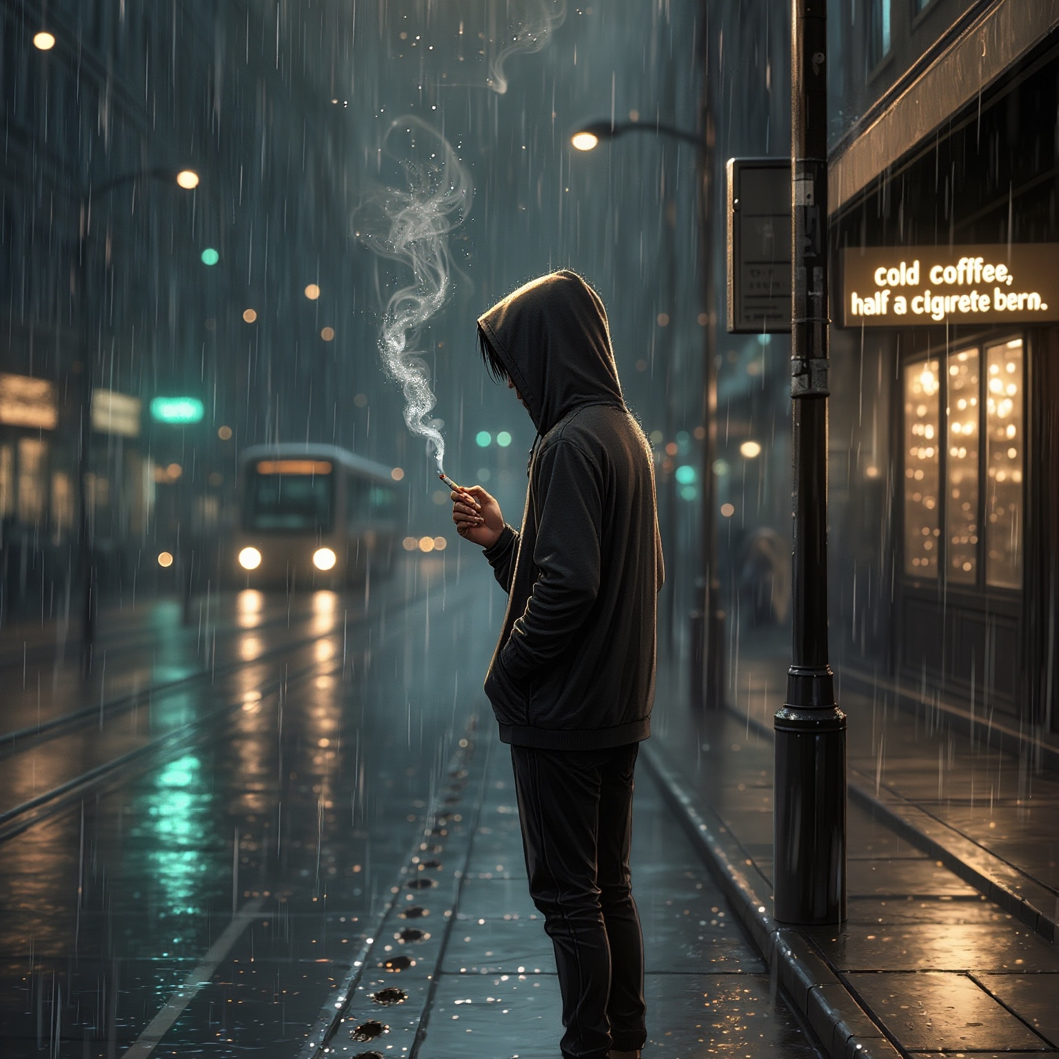 Emotional Lo-Fi Rap, Melancholic Melodic Hook, Male vocal, soft emotional rap flow with melodic delivery in chorus, Whispery bridge and spoken outro for mood depth, Lo-Fi ambient synths, clean electric guitar picking, soft wind FX, light rain sounds, 808 sub-bass, minimal lo-fi drums, vocal pad, lo-fi tape hiss FX, Dreamy Indie Vibes, Urban solitude, heartbreak, Introspective, nostalgic, and cinematic