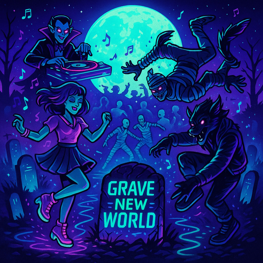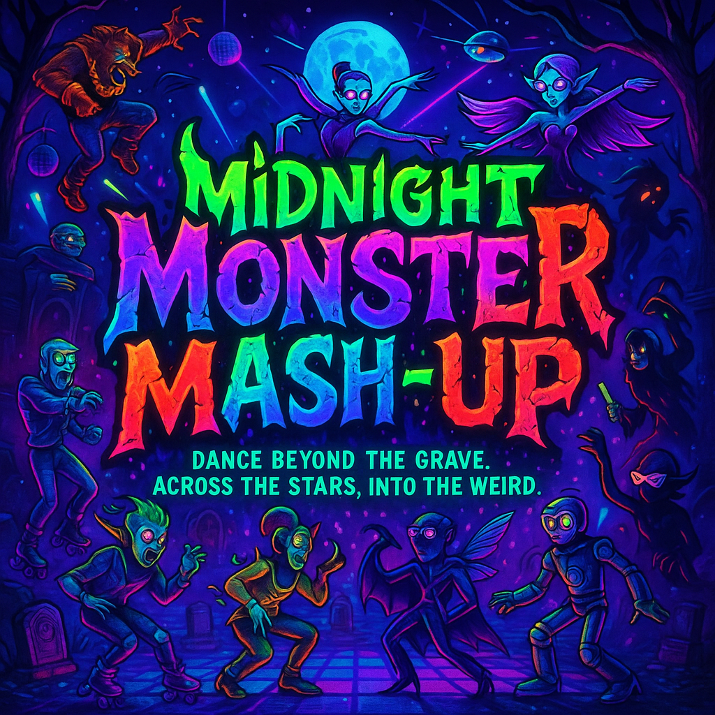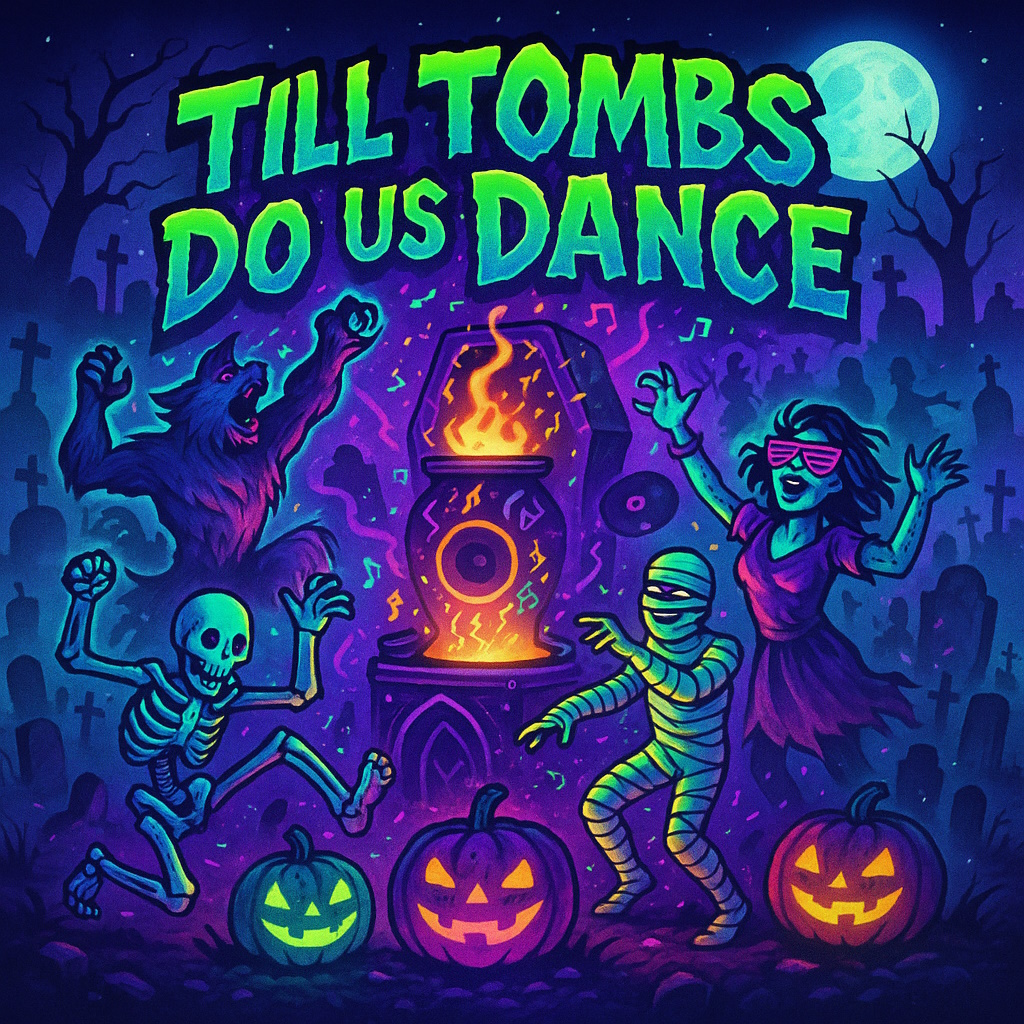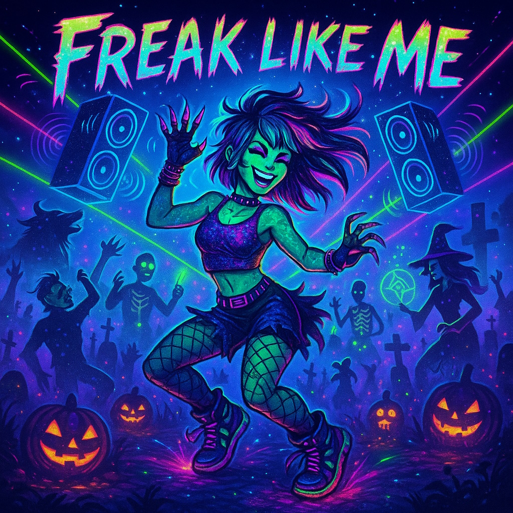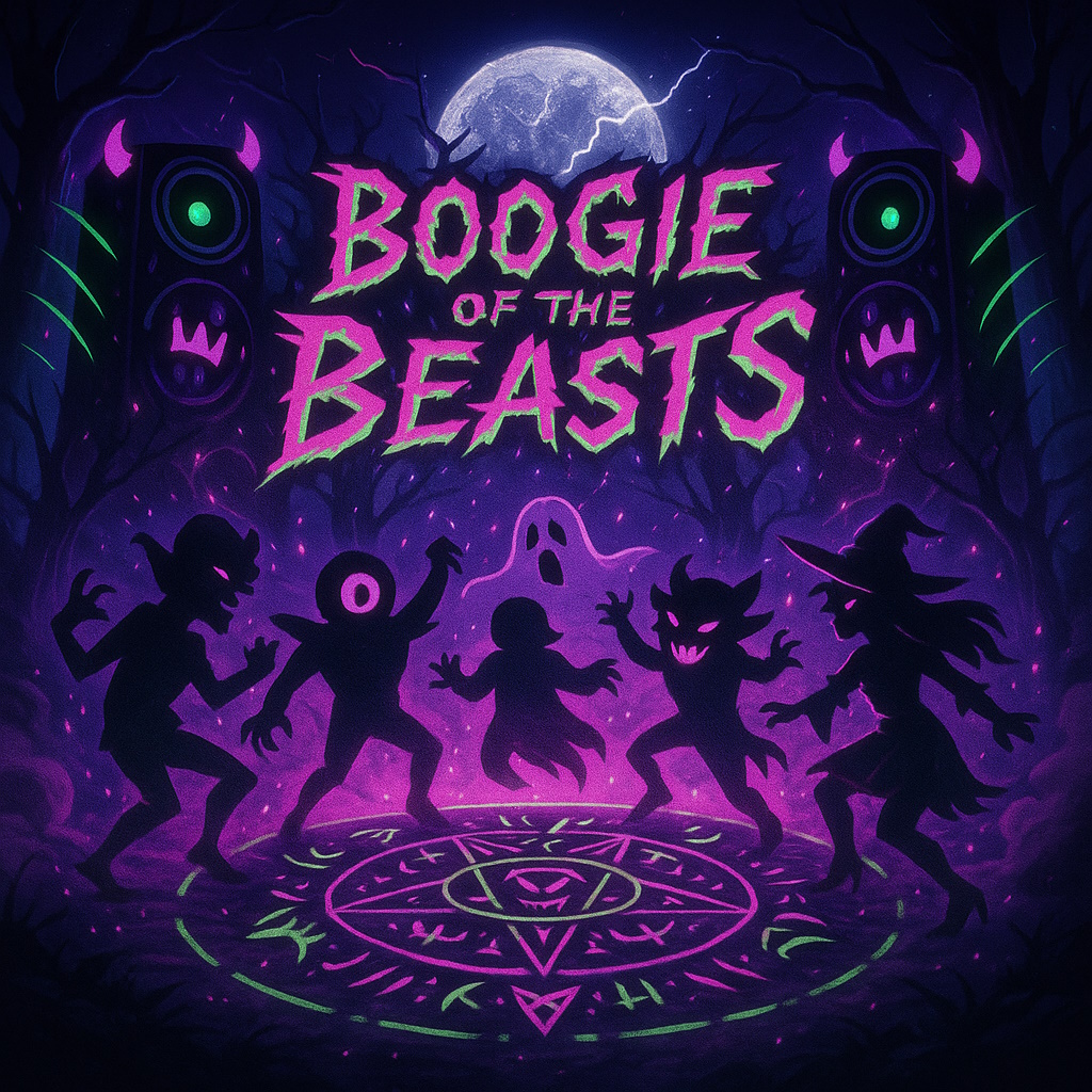 A high-energy Halloween monster party dance anthem with explosive beats and a heavy, bouncy bassline, Blending electronic dance-pop with spooky fantasy elements, the song features pounding drums, gritty synths, funky slap bass, and blaring trombones, Female vocals lead with fierce, playful delivery — confident, powerful, and full of magical flair, Layer in sound effects like rising from graves, spell-casting sparkles, and distant howls, The chorus is massive and anthemic, built to shake crypts and graveyards, Think rave-in-the-underground, full moon glowsticks, and undead creatures grooving until sunrise, Dance tempo between 128–132 BPM