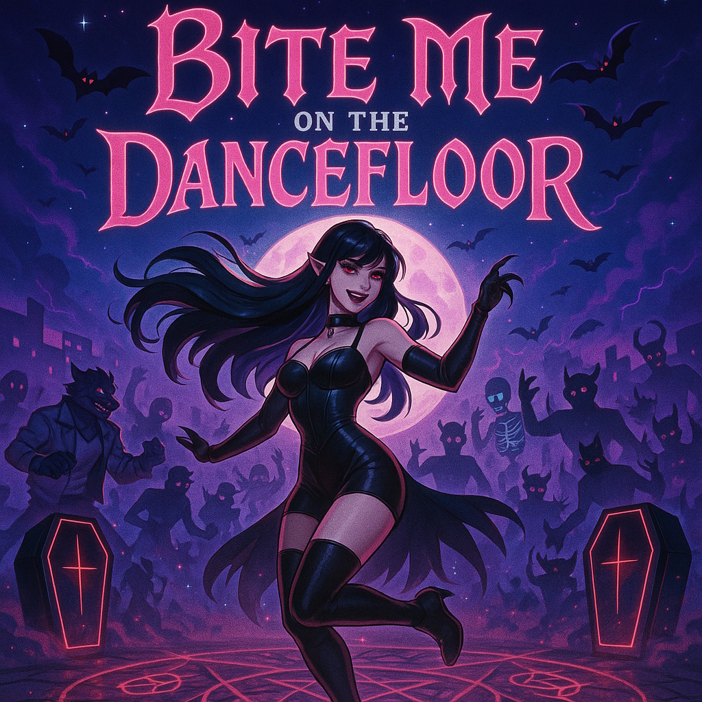 An electrifying dance house and techno fusion track featuring seductive teen female vocals, The beat is uptempo and infectious, driven by thumping four-on-the-floor kick drums, shimmering hi-hats, and pulsing synth bass, Layered brass stabs — especially trombones — add a punchy, jazzy strut to the rhythm, giving the track a sultry swagger, The vibe is supernatural and playful, like a vampire temptress ruling a haunted nightclub under the full moon, Vocals alternate between breathy teasing and bold melodic hooks, with whispered harmonies haunting the chorus, The bridge drops into a smoky breakdown with echoing brass and glitchy FX before slamming into a final euphoric chorus