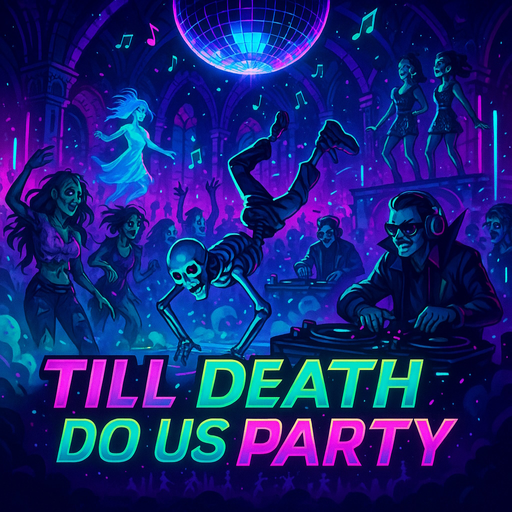 A high-energy dance track with pulsing bass, loud trombones, Arriba style energy, and layered pop-style female vocals, Features a glam-goth ghost girl theme with chaotic, fierce, and flirty delivery, Multiple female vocal layers create an anthem-like chorus, blending attitude and sass, The beat is loud and club-ready, brass bursts, and a driving rhythm built for the dancefloor, Includes a haunting breakdown section and a powerful, chant-style hook, Female vocals are stylish, emotional, and energetic with moments of whisper, belt, and harmony, Think supernatural glam rave with ghostly flair