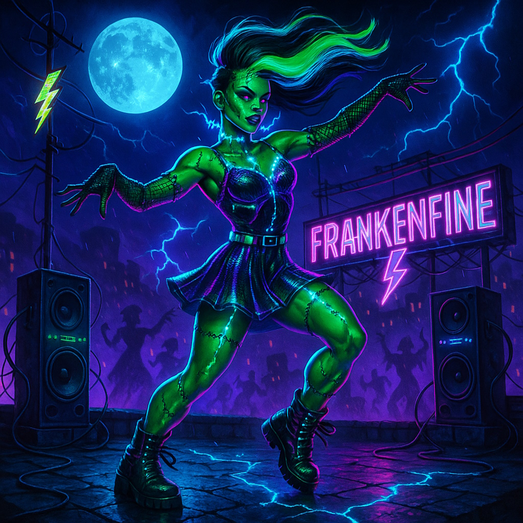 High-energy electro dance pop anthem with fierce female vocals and a monster-club vibe, Inspired by electrified beats, heavy synth basslines, and thunderous snare hits, the song features glitchy vocal effects, sharp transitions, and a bold, confident delivery, Female lead vocals should be bold, flirty, and commanding, with chant-style hooks and dramatic flair, Think charged-up verses, explosive choruses, and a breakdown section filled with robotic whispers and electric sound FX, The atmosphere blends Halloween party glam with club-floor dominance — bolts, boots, bass, and lightning, Title: Frankenfine — a stitched-up dancefloor queen who slays the night with every spark, Tempo fast, groove thick, and energy relentless