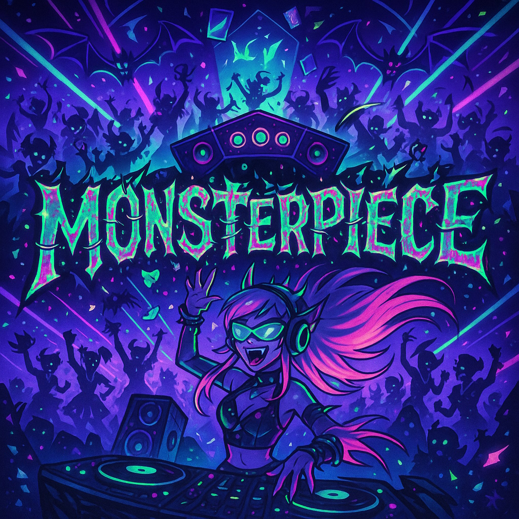 High-energy K-pop dance anthem with female vocals, built for a monster-themed rave at midnight, Features a flashy, bouncing bassline layered with stomping kicks, sharp claps, and loud snare hits that crack like lightning, Infused with brass elements — bold trombones and playful horn stabs — to bring a vibrant, arriba-style Latin energy to the rhythm, Includes glittering synth textures, ghostly vocal FX, and supernatural percussive breaks to support chantable hooks and danceable verses, The vibe is electric and theatrical, with a graveyard-meets-cosmic party atmosphere where monsters from all realms — vampires, aliens, sea beasts, and witches — gather to groove, Perfect for a midnight monster dance-off with fearless flair and supernatural swagger