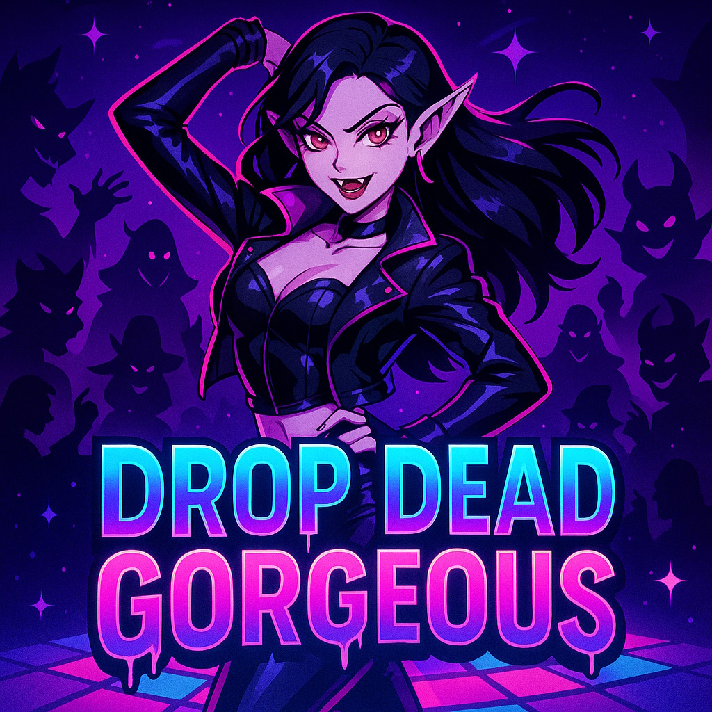 A high-energy dance track with breakbeat bass and sharp snare hits, blending dark glam and glitchy pop, Female teen K-pop vocals with layered harmonies and fierce attitude, channeling undead cheerleader idol energy, Includes a powerful, catchy chorus and spooky vocal textures, Drum and bass groove drives the rhythm with punchy drops and vinyl scratches, Features a horror-pop bridge and an instrumental breakdance solo, Tempo is fast, club-ready, and rebellious — perfect for a crypt-shaking stage performance by a fierce all-girl monster idol group, No rap, just vocals with rhythmic bounce and eerie charm