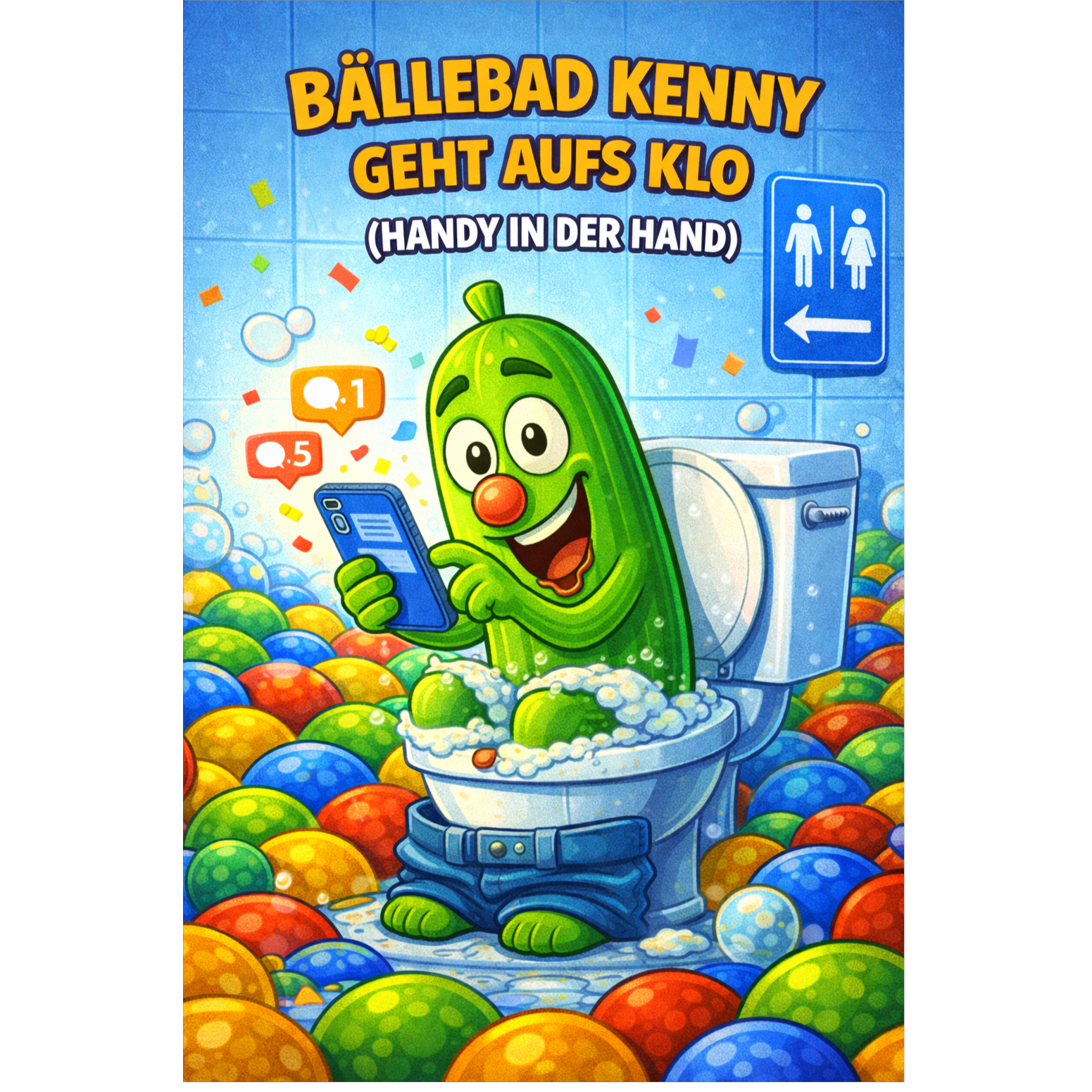 Playful, humorous pop dance song with a cartoon vibe, Theme: "Bällebad Kenny geht aufs Klo mit Handy in der Hand" – lighthearted everyday comedy, funny but clean, Mood: cheerful, silly, upbeat, friendly, Tempo: 115–125 BPM, Instruments: bouncy synths, funky bass, claps, light drums, subtle notification sound effects, Vocals: expressive male or neutral lead vocal, catchy chorus, playful delivery, Style: comedy pop, kids-friendly, animated cartoon soundtrack, Language: German, Structure: intro, verses, pre-chorus, big chorus, bridge, final chorus, Length: approx, 3 minutes