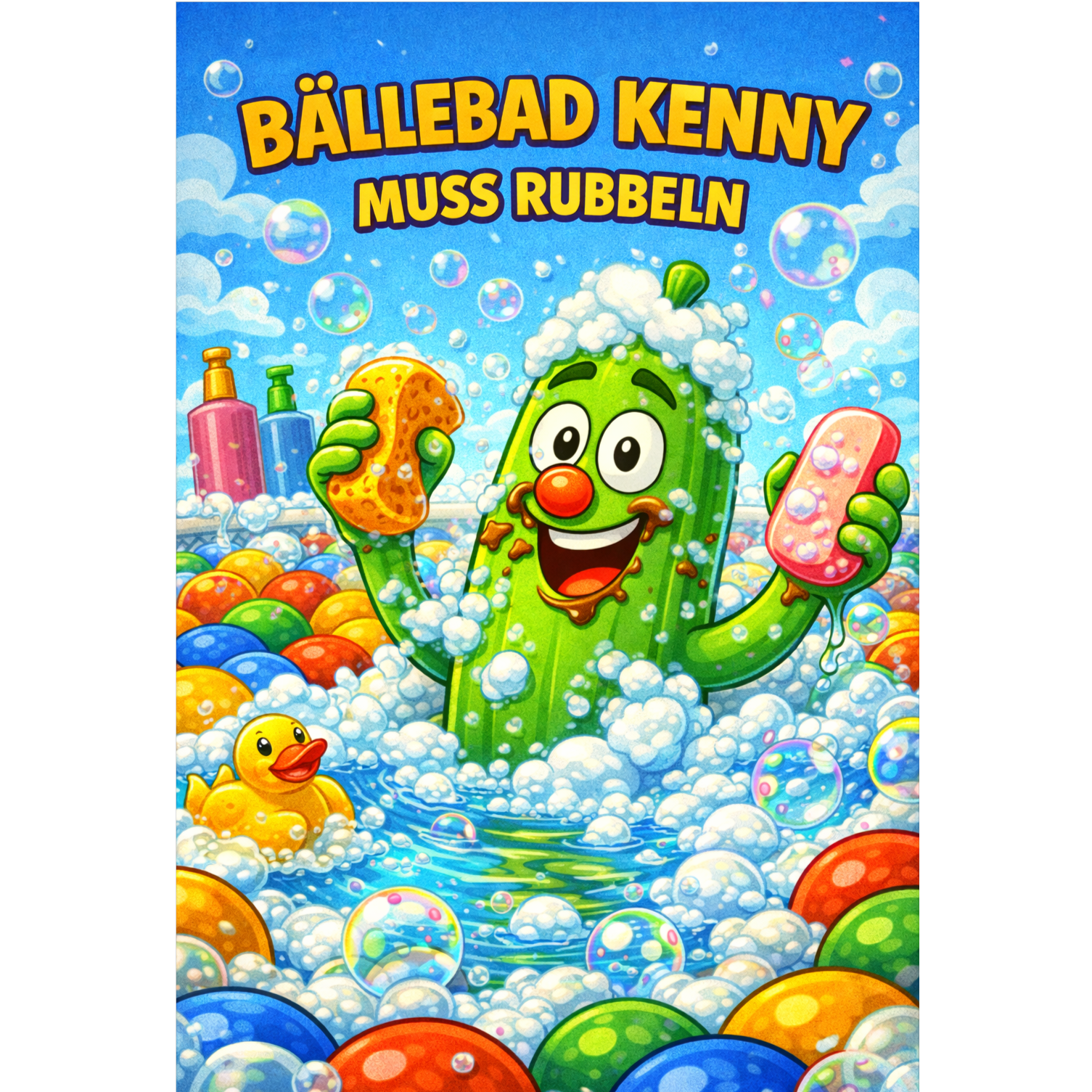Upbeat, playful pop song with humor and child-friendly fun, Theme: "Bällebad Kenny muss rubbeln" – Kenny cleans and scrubs in a colorful ball pit full of soap, bubbles, and laughter, Mood: cheerful, energetic, silly, cartoonish, Tempo: 120–125 BPM, danceable, Instruments: bouncy synths, bright bass, claps, playful bubble sound effects, light drums, Vocals: expressive, fun lead vocal with a catchy sing-along chorus, Style: kids pop, comedy dance song, animated cartoon vibe, Language: German, Structure: intro, verses, pre-chorus, big chorus, bridge, final chorus, Length: around 3–3, 5 minutes