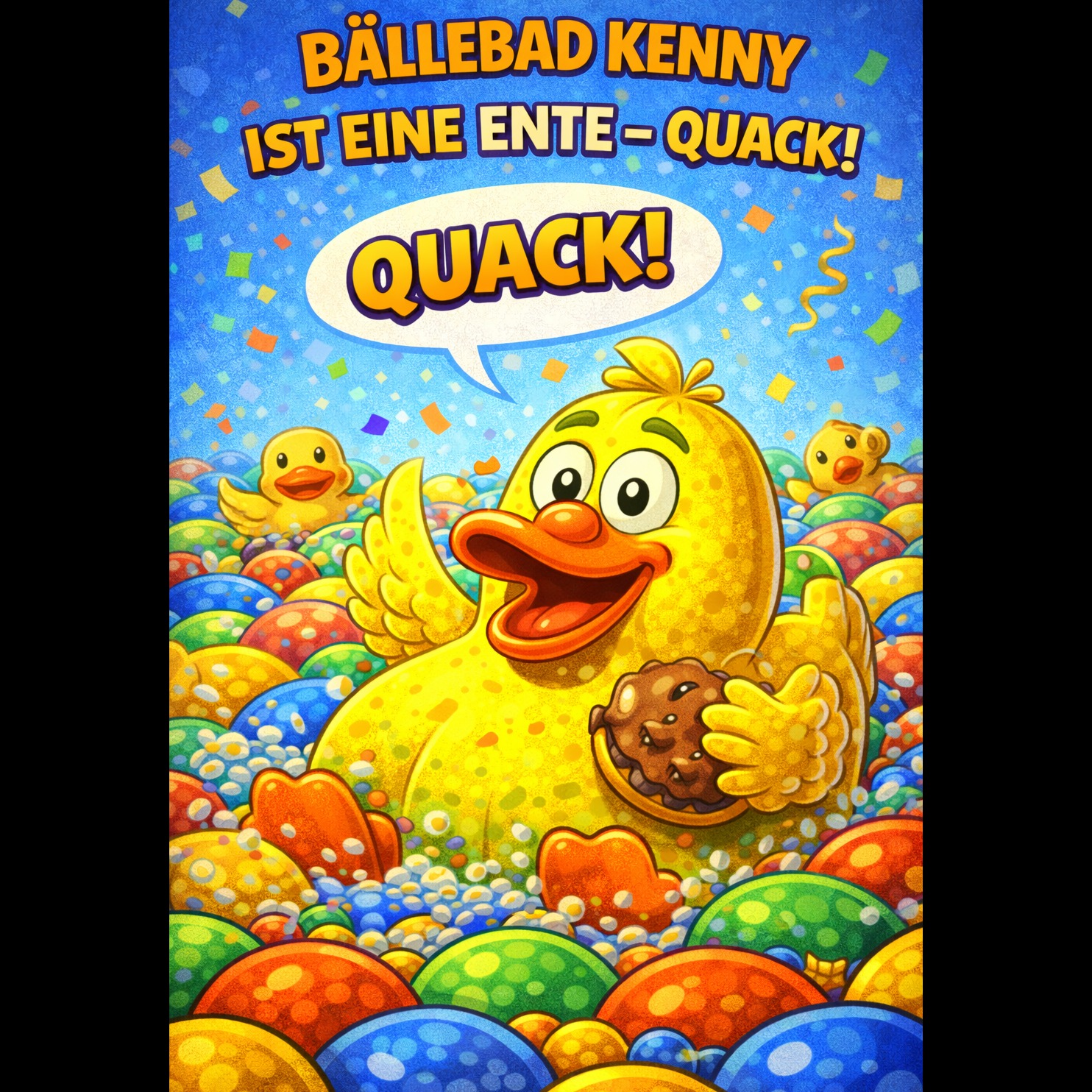 Funny upbeat cartoon pop song about “Bällebad Kenny turning into a duck”, Mood: silly, playful, energetic, family-friendly, Tempo: 120–130 BPM, Style: comedy pop, dance cartoon soundtrack, playful children’s TV vibe, Instruments: bouncy synths, funky bass, claps, whistles, toy instruments, duck quack sound effects, Vocals: expressive cartoon male voice with humorous delivery, catchy chorus with crowd shouting “QUACK!”, Language: German, Structure: intro, verse, pre-chorus, big chorus, second verse, bridge, final chorus, outro, Length: about 3 minutes