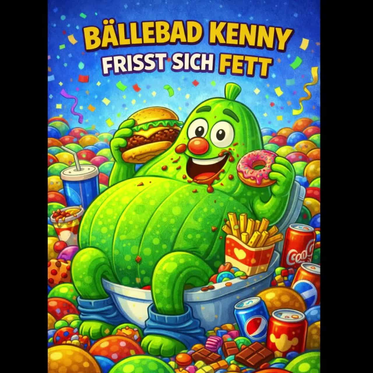 Fun cartoon-style party pop song with humorous exaggeration, Theme: "Bällebad Kenny frisst sich FETT" – playful, silly, over-the-top eating comedy, Mood: energetic, goofy, bright, exaggerated, Tempo: 120–130 BPM, Instruments: bouncy synths, funky bass, claps, party horns, playful sound effects, Vocals: expressive male cartoon voice, catchy chorus, humorous delivery, Style: kids-friendly comedy pop, animated soundtrack vibe, Language: German, Structure: intro, verses, pre-chorus, big chorus, bridge, final chorus, Length: approx, 3 minutes