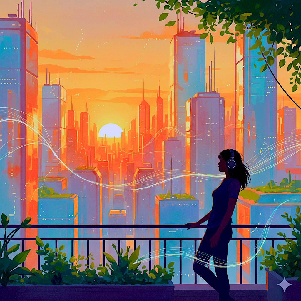 A bright, introspective synthwave-lofi chill fusion with soft Kora motifs and warm analog pads, Around 94 BPM in A major, it flows like a peaceful day in a bustling city where everything feels effortlessly aligned, Delicate two-note Kora phrases weave between dreamy electric piano chords and smooth lo-fi drums, Gentle vocals deliver poetic verses and a memorable hook: “Drift and breathe, until the world turns free, ” The mood is content, flowing, and quietly uplifting — a song about stillness within motion and the soft illusion of perfect harmony