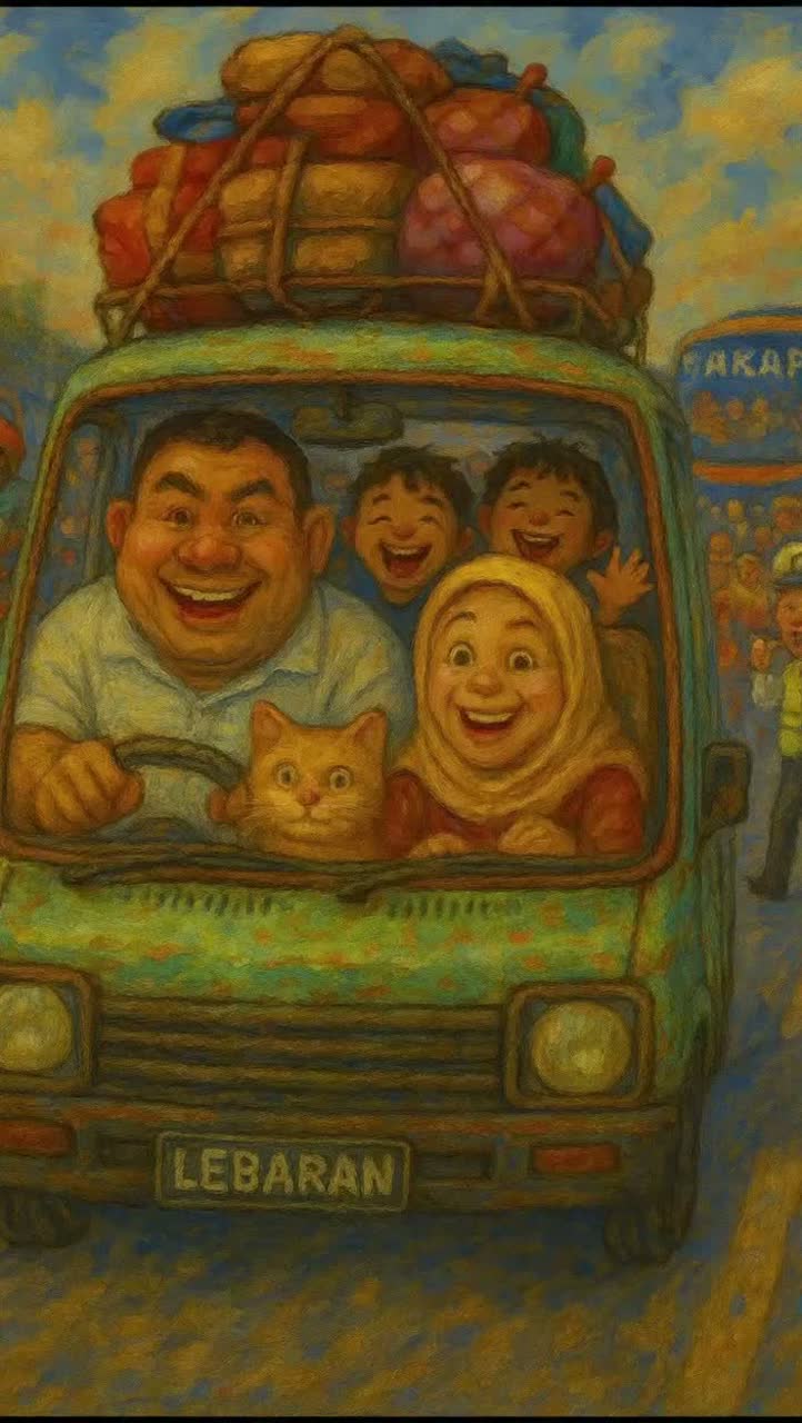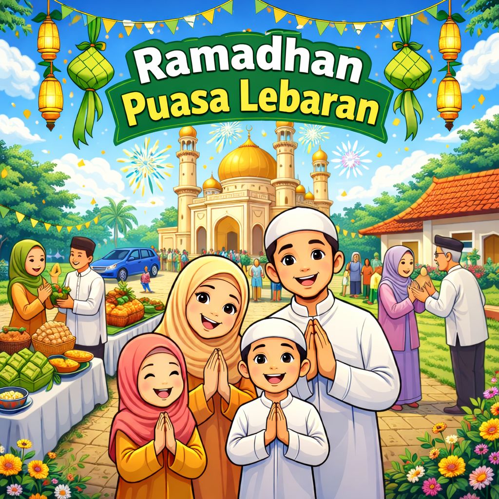 Indonesian happy uplifting pop raya song, joyful mood, bright cheerful male vocal, smiling tone, energetic but warm delivery, acoustic guitar, bright piano, light pop drums, soft bass groove, hand claps, festive atmosphere, catchy melody, family celebration vibe, eid al-fitr raya theme, clean modern mix, radio friendly, high quality production