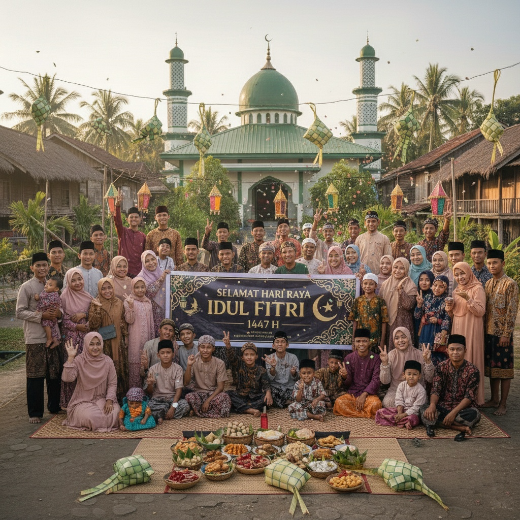 metal, Religious song with Arabic/shalawat-style melody and spiritual atmosphere, combined with traditional Minangkabau (West Sumatran) music, Use talempong, saluang, and soft traditional percussion, Tempo medium-slow, emotional and warm, Male vocal with soulful, humble delivery, Chorus uplifting and communal, Verse rap with gentle hip-hop flow that blends naturally into ethnic instruments, Atmosphere of Eid al-Fitr, forgiveness, peace, and returning to purity, High quality, cinematic, heartfelt
