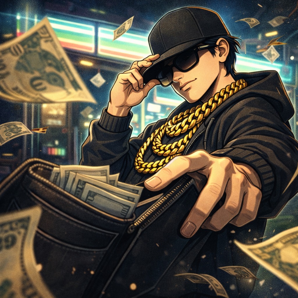 dark commercial gangster rap with catchy chant hook, heavy sub-bass, hard trap drums, low brass stabs, cold synth texture, confident male vocal, short punchy lines, micro-episode storytelling, expensive swagger, polished but gritty mix