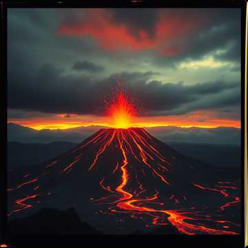 Epic orchestral track capturing volcanic chaos, rumbling low strings, deep brass, thunderous percussion (timpani, taiko), soaring violins, heroic French horn, A chanting choir, clear enunciation vocal