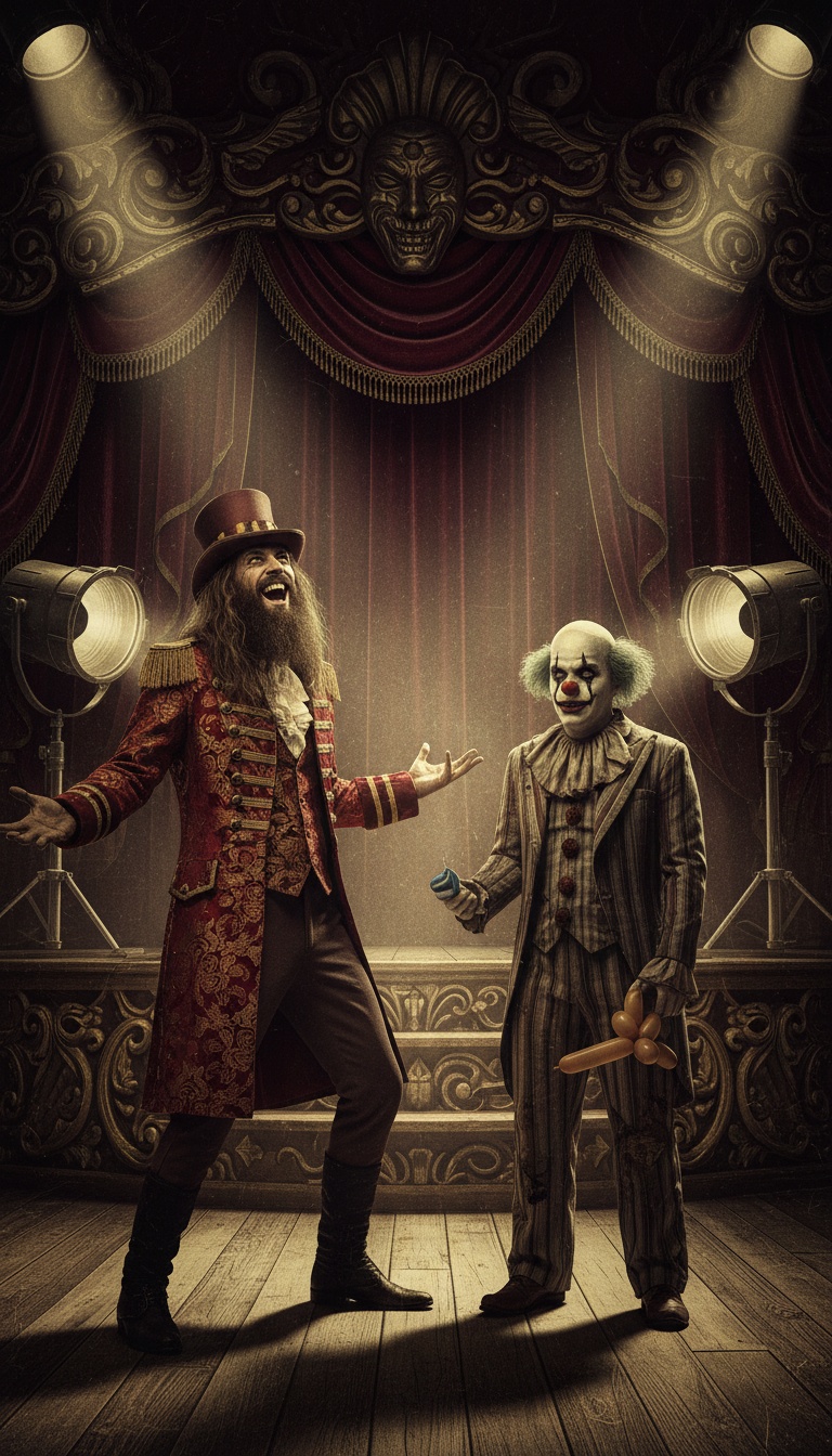 cinematic boom bap, dark trap opera, baritone lead, projected male vocals, sassy female adlibs, string stabs, church organ chords, 808 sub-bass, distorted snare cracks, triplet hi-hats, chopped choir samples, vinyl crackle, tape saturation, slapback delay, wide stereo image, 90s mix grit, minor key menace, swaggering groove, halftime swing, intro verse hook structure