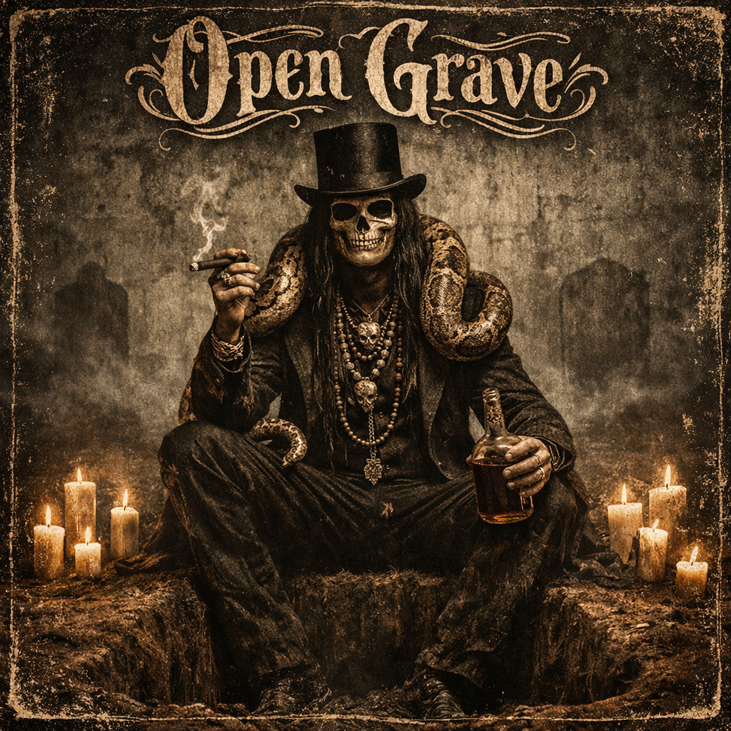 Ritual big beat / ethnographic breakbeat, Hybrid of traditional Ghede rite BANDA rhythm and 90s UK big beat, Tempo 98-112 BPM, Rhythmic foundation: live polyrhythmic banda drums — sampled, looped, layered with heavy breakbeat edits, Iron bell and rattle maintain ceremonial pulse over funky, distorted breaks, Structure: call-and-response vocals in Haitian Creole — male ritual chants answered by processed female chorus, Verses sparse with raw drums and distant field recordings (cemetery ambience, wind, ritual laughter), Choruses: filtered loops, massive analogue basslines, treated drum samples chopped as breakbeats, synthetic dub priest FX, filtered vocal stabs, Mood: dark carnivalesque, Death-as-celebration, Crossroads at midnight — voodoo ceremony colliding with abandoned warehouse rave, Baron Samedi's procession through smoke machines and strobes, Sacred and profane intertwined, Drums treated with bit-crushing and spring reverb, Occasional orchestral stabs for epic tension