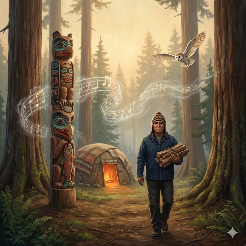 • Instruments: Soft Lummi-inspired hand drums, flutes, subtle ambient forest sounds