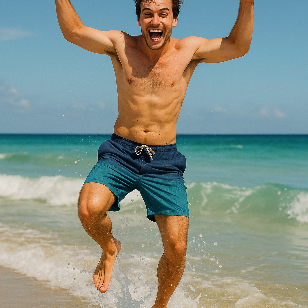 sunny Japanese pop rock with a bouncy shuffle groove, Bright electric guitars with funky comping, cheerful brass lines, warm electric organ, and middle age energetic male vocals, Feel like a seaside festival: joyful, middle-tempo, playful phrasing, and catchy chorus hooks, Arrangement reminiscent of lively late-80s to mid-90s Japanese summer pop bands, with congas, shakers, and breezy sax riffs
