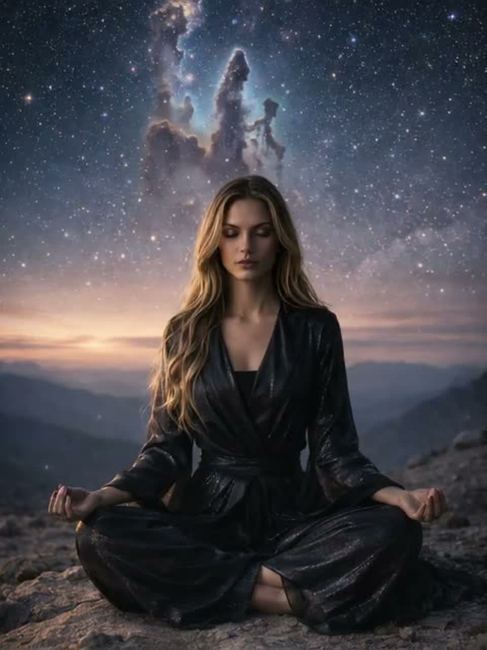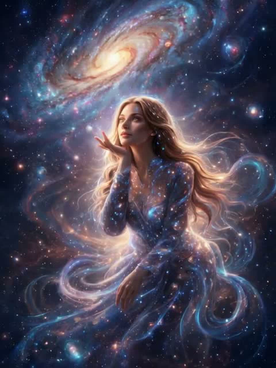 Cinematic atmospheric alternative hard rock at 105 BPM, minor key, mysterious yet dynamic and immersive, Minimal piano arpeggios and ambient pads in verses, deep sub-bass pulses with more rhythmic drive, Ethereal female vocal, intimate and breathy in verses, emotional but controlled in choruses, phrases connected for fluid pacing, Percussion subtly driving, soft hi-hats and low toms, electronic textures accentuating tension, Shimmering electric guitar layers and evolving synths create cosmic space and hidden signals, Dynamic structure: compact immersive intro → tense but shorter verses → energetic pre-choruses → expansive choruses → reflective bridge → final chorus, layered harmonies, cinematic energy, Conceptual motifs: frequencies, signals, cosmic whispers, and the universe recognizing Elyra, Mood progression: curiosity → discovery → connection with the vast unseen