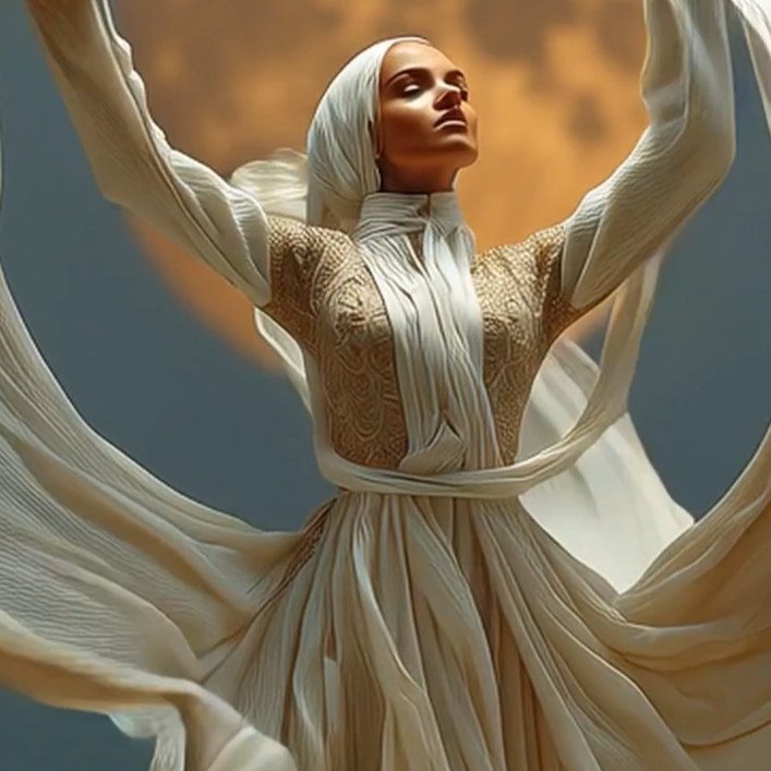 Ambient Orchestral with Middle Eastern elements, mystical Sufi atmosphere, ethereal strings, ney flute, oud, qanun, frame drums, choir voices, cinematic soundscape, contemplative to ecstatic journey, drone bass, reverb-drenched vocals, spiritual trance, building intensity, 80-100 BPM