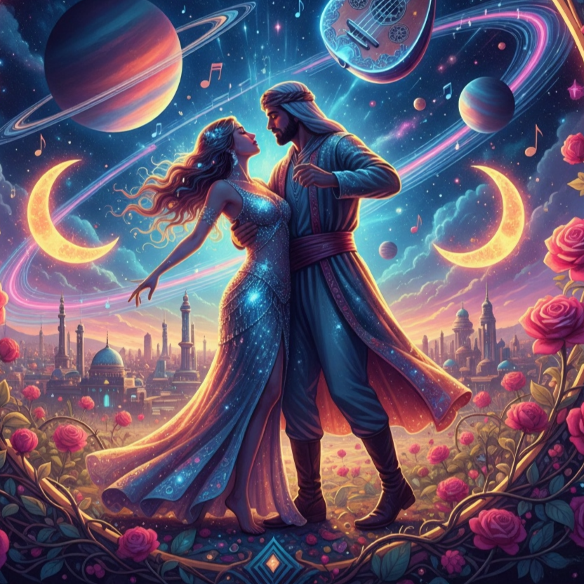 Duet, dynamic vocal ranges, A luminous fusion where Persian mysticism meets late-night hip-hop and dream-drug haze, The hook glides like a prayer turned groove-melodic phrases recall themselves in one breath, weaving Farsi inflections with trap-tempo heartbeat, Harmony blooms from minor modal roots, folding Persian airy synths over a liquid cycle that melts between tradition and pulse, The rhythm swings with velvet swagger: crisp snares and whispered 808s trap verses that flow like meditation over motion, Vocals shimmer half-rap, half-invocation each bar a breath between spirit and street, Textures layer smoke and silk: reverb-drenched ney flute, tremolo bass, lo-fi hiss like incense, The energy arcs from dusk introspection to sunrise release, echoing death-to-rebirth, Ends with a loop that begs replay, equally at home in desert wind or neon skyline