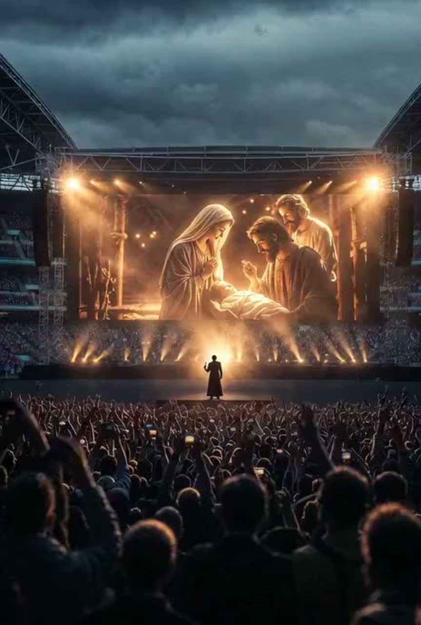 Massive Symphonic Metal Christmas Anthem, Wembley-scale, Start immediately with lead vocal line — no intro, no ambient buildup, no vocalizations, Texture: molten brass, thunderous low strings, gritty guitars, crystalline bells, colossal timpani, Male tenor lirico-spinto lead (warm, ringing, emotionally blazing), heroic stadium projection, Crowd pressure: roaring Wembley audience swelling under climaxes (background only), Rhythmic drive: double-kick surges, tremolo riffs, wide cinematic orchestra, Latin hymn delivered with operatic metal intensity, Clip Volume: Vocals +4, Guitars +3, Orchestra +3, Drums +2, ‑Female voices Female Vocals Choir Wordless Vocals Vocalizations Intro Vocals