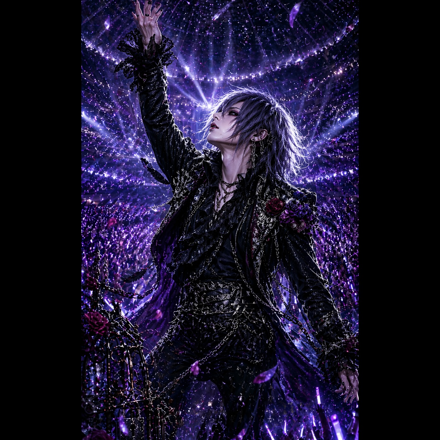 A sharp and theatrical live performance in a dark, expansive arena, The male vocals are high-pitched with a cloying nasal tone, unique glissando endings, and a signature decadent visual-kei vibrato, delivering lines with piercing clarity, Intensity is expressed through dramatic, operatic phrasing and neurotic energy, The soundscape is vast and immersive with 3D spatial depth, blending sharp distorted guitars with a refined, dark rock aesthetic and high-velocity drumming, ‑studio recording, ‑flat sound, ‑acoustic, ‑slow tempo, ‑screaming, ‑shouting, ‑barking, ‑low energy, ‑pop, ‑clean polish