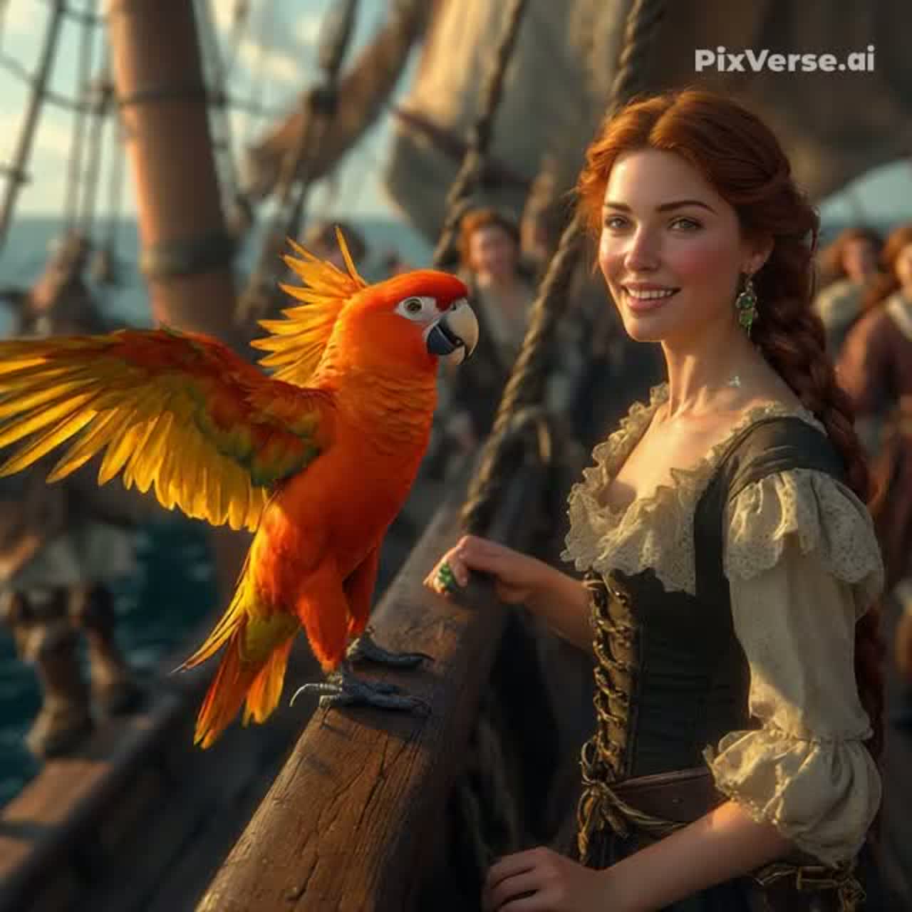 une bande originale de film de thème pirate atmosphérique en 4/4, ~86 BPM, mode dorien, Harmonies : i–VII–VI, accords ouverts, drones graves, Voix latine soliste féminine, [ Chœurs mixtes en français, ] [Cordes : violons/altos en legato suspendu, violoncelles en oscillations i–VII, harmoniques pour texture aérienne, Bois : flûtes marines et hautbois, Percussions : tambour de pont, Synthés : pads de vent marin, bruit blanc filtré pour le ressac, large réverbération, Thème principal : motif 4 notes conjointes, attaque douce, glissando, résolution sur tierce mineure, variations ornementales, Construction progressive : voix → pads → cordes → percussions → chœurs, ]