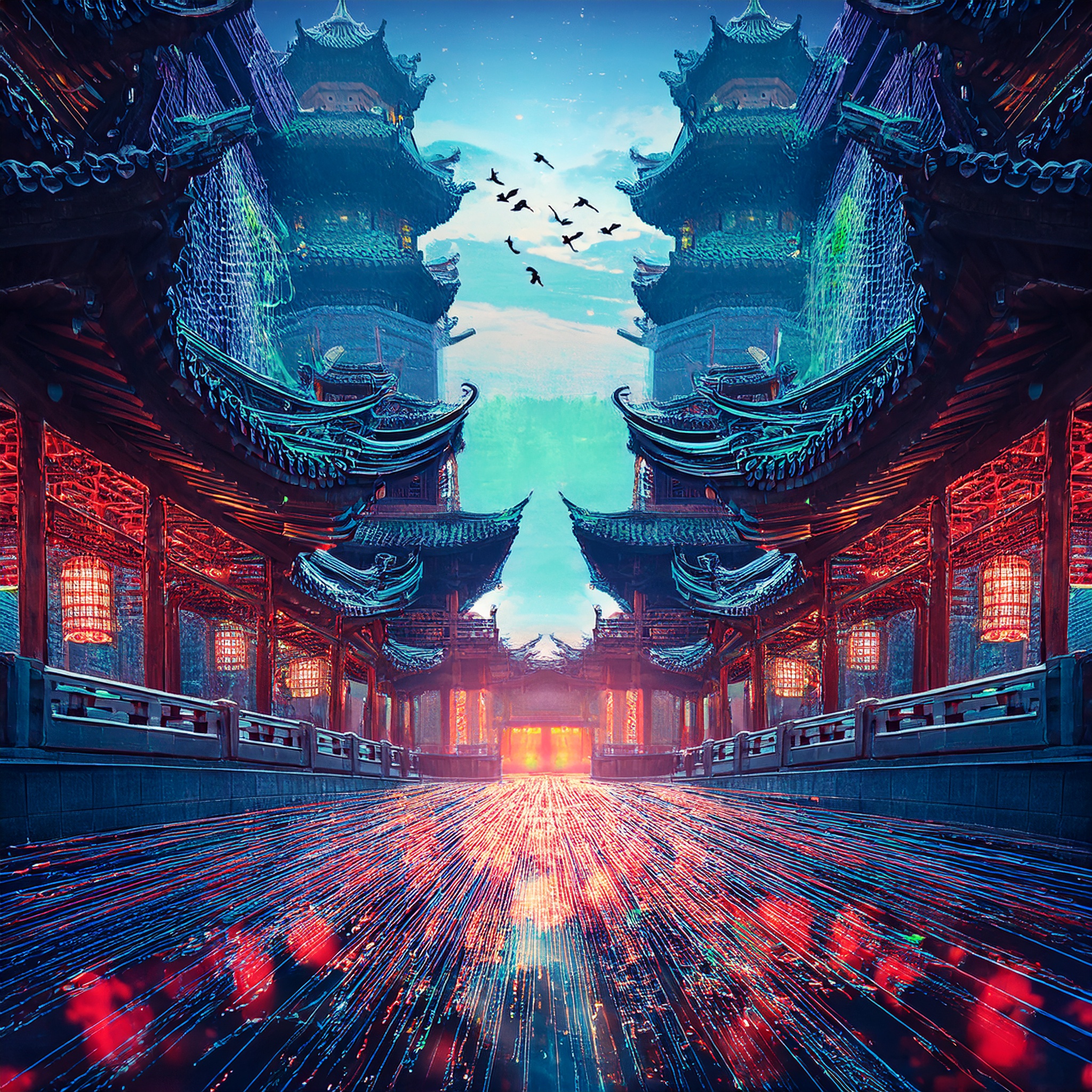 Concept: A spinning electronic roulette determines fate across Heaven, Earth, and the Underworld, Pulses interfere with random paths, guiding the listener toward the celestial route, Sound: Metallic synths, driving EDM beats, electronic strings, The interlude features a chaotic dance of glitchy electronic sounds, Vocals: Male and female vocals compete and intertwine, expressing the tension of choice and destiny, Keywords: electronic roulette, celestial route, random pulses, light circuits, underworld shadows, earthly heartbeat, divine selection