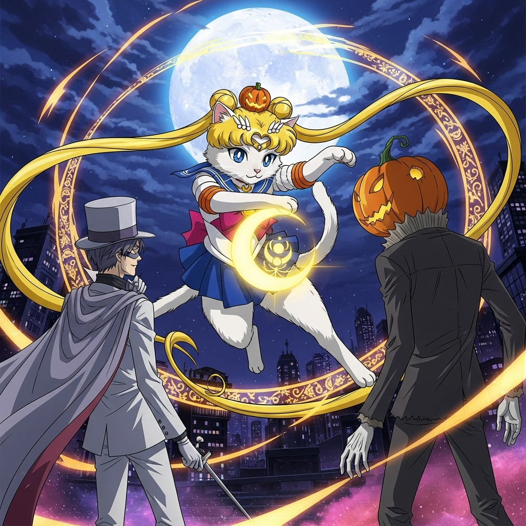 J-pop with gothic Halloween undertones, mysterious and tense; clockwork music-box intro with ticking clocks and winding gears, celeste and detuned music box, then swell into moonlit magical-girl grandeur; minor key color on E major tonic with modal mixture; dark synth pads, filtered guitars, tom-heavy drums, whispered ad-libs; third-person narrator vibe; avoid overly cheerful chords; incorporate chime hits and distant bell tower; "Sailor-moon-esque" heroic lift without naming artists