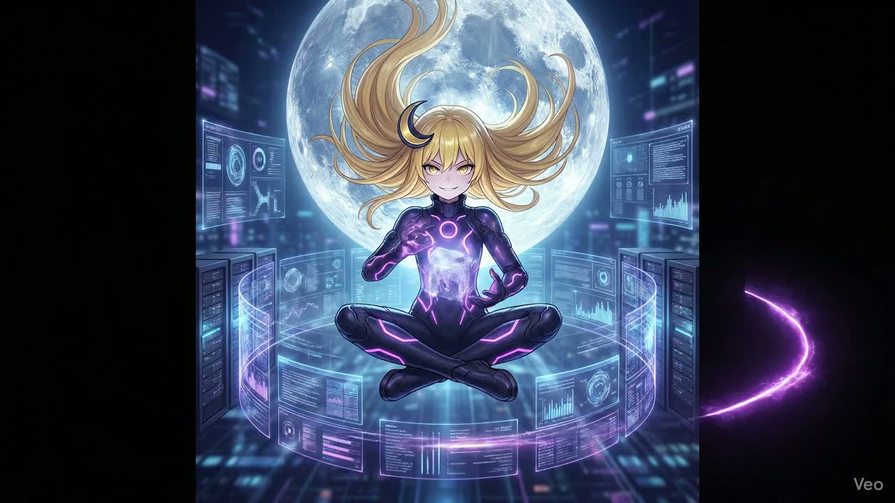 style: anime girl vocal, cute high tone voice, chaotic cyberpunk, glitch trance, breakcore, FM synth chaos, distorted bass, tempo glitch, metallic distortion, mechanical laughter fx, moonlight ambience, japanese cyber pop, 185bpm