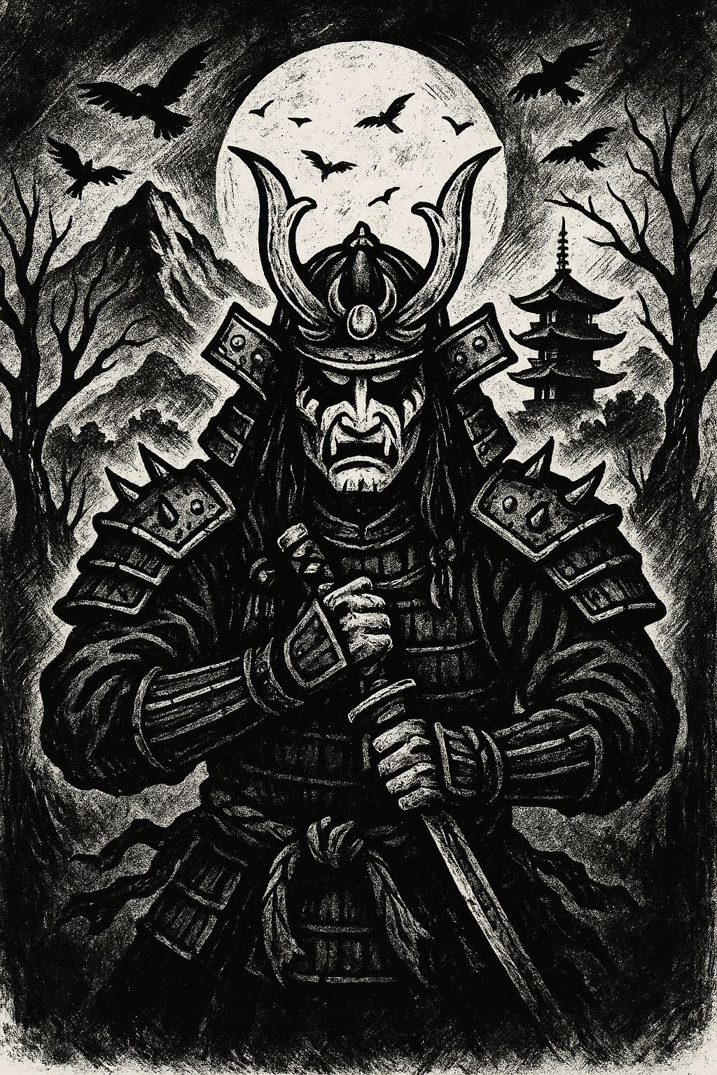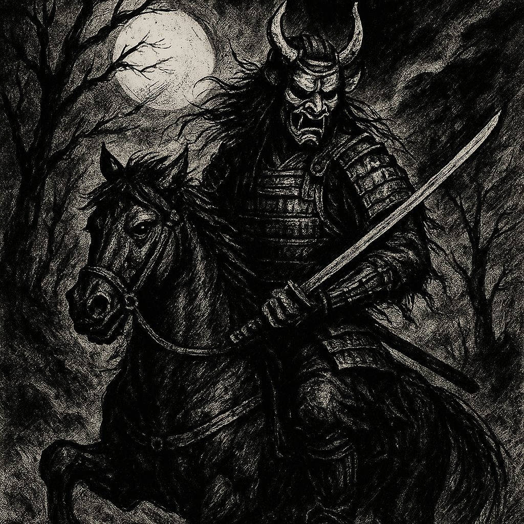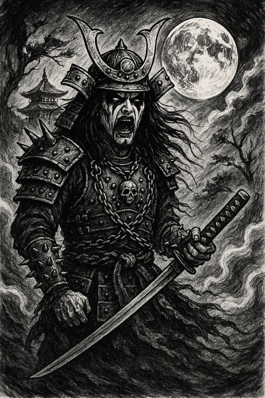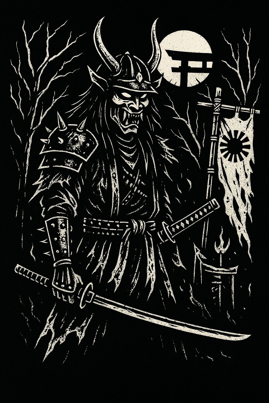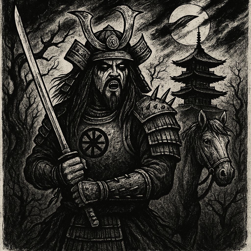 Raw primitive early 1990s black metal with cold lo-fi underground demo tape production, Harsh tremolo-picked guitars, fast blast beats, distant raspy buried vocals, and repetitive hypnotic riffs, Dark, nihilistic, ritualistic atmosphere like a forest cult recording on degraded tape, Subtle Japanese traditional instrumentation woven into the background for atmosphere: eerie Shakuhachi melodies for wind-like spiritual ambiance, minimal haunting Koto passages during transitions, and heavy ritual accents from Taiko used sparingly in climactic moments, Occasional shamisen-like plucked tension for ancient ritual feel, Structure is repetitive, trance-like, and atmospheric with sudden shifts between violent black metal and quiet ritual interludes, Black metal must remain dominant, with Japanese elements acting as ghostly atmospheric layers, Feels like a lost black metal demo discovered in an abandoned Japanese mountain shrine