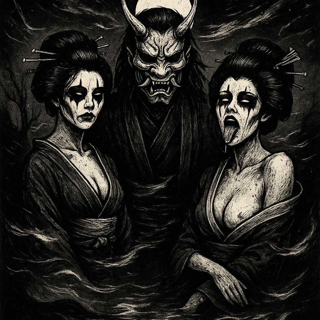 Raw primitive early 1990s black metal with cold lo-fi underground demo tape production, Harsh tremolo-picked guitars, fast blast beats, distant raspy buried vocals, and repetitive hypnotic riffs, Dark, nihilistic, ritualistic atmosphere like a forest cult recording on degraded tape, Subtle Japanese traditional instrumentation woven into the background for atmosphere: eerie Shakuhachi melodies for wind-like spiritual ambiance, minimal haunting Koto passages during transitions, and heavy ritual accents from Taiko used sparingly in climactic moments, Occasional shamisen-like plucked tension for ancient ritual feel, Structure is repetitive and atmospheric with sudden shifts between violent black metal and quiet ritual interludes, Black metal must remain dominant, with Japanese elements acting as ghostly atmospheric layers, Feels like a lost black metal demo discovered in an abandoned Japanese mountain shrine