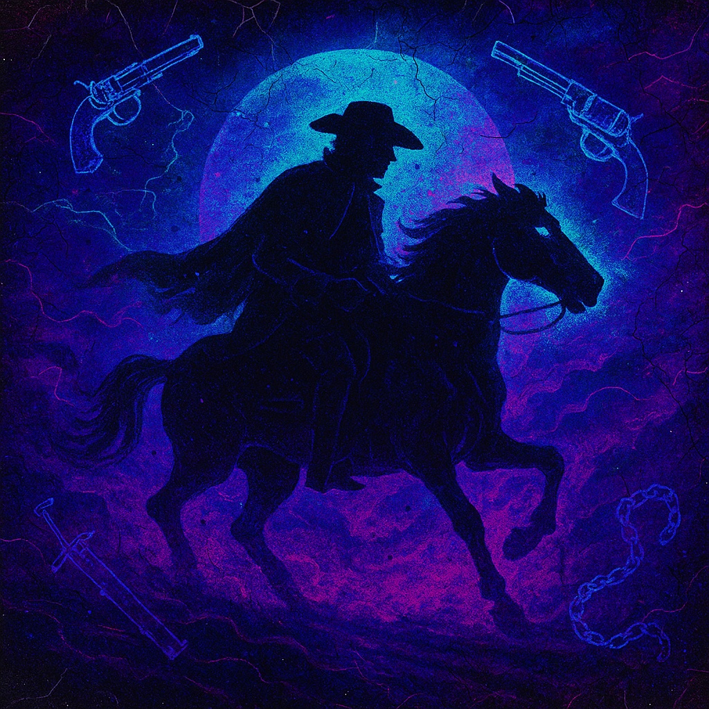 Outlaw Country fused with riff based hard rock and vintage blues, Electric guitar focus, Spice it up with subtle edm and gospel vibes, Minor key, upbeat, Highly experimental, Avant-garde male vocals with improvisational flair