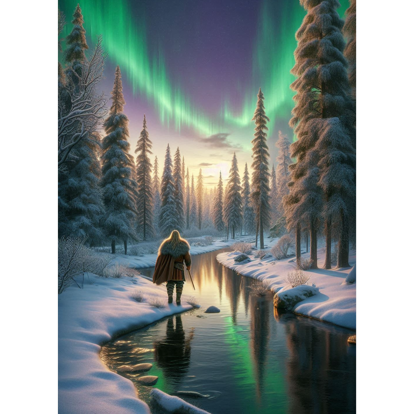 Epic symphonic power metal track soaring operatic vocals, fast melodic guitar riffs, thunderous double bass drums, grand orchestral strings and choirs, cinematic atmospheric keys, dramatic pre-chorus in Finnish, multi-layered epic choruses, intense guitar solos weaving with orchestral sweeps, heroic and mystical mood, stormy winds, glowing northern lights imagery, ice and snow landscapes, night turning to dawn, fantasy epic battle and triumph energy, highly melodic, cinematic and theatrical, emotionally charged, perfect balance of heavy metal aggression and operatic melody