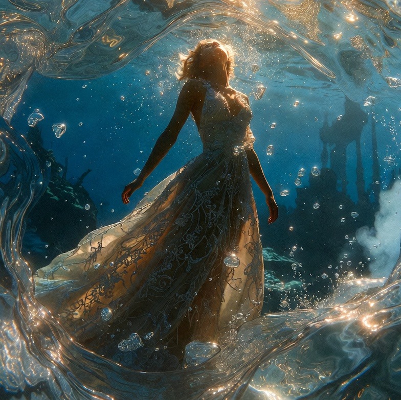 [Instrumentation: Celtic harp and celesta for refracted light sparkles, deep cello and contrabass drones for abyssal weight, analog synth pads and filtered bass pulses for currents, bubble-mimicking percussion and hydrophone samples, with electric guitar swells and distortion in the bridge for the genre-blending veer]