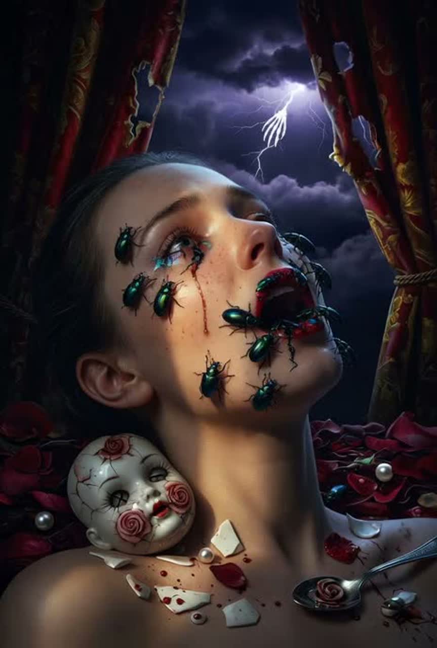 [Instruments: Haunting baroque strings (weathered cello, trembling violin), antique harpsichord with subtle detune, deep sub-bass pulses like a heartbeat under siege, metallic percussion (spoon clinks, chitin synth clicks, porcelain shatter samples), glitchy electronic swarms, distant thunder field recordings, warm velvet pads turning icy and fractured], ‑pop, ‑rock, ‑upbeat dance, ‑clean polished R&B, ‑standard verse-chorus structures, ‑generic horror-movie screams, ‑sanitized folk, ‑bright major-key resolutions"
