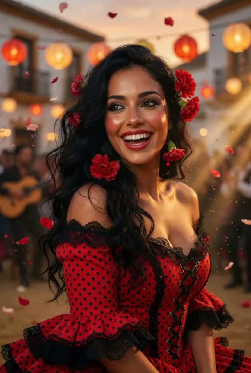 Instruments: "Fluent Spanish flamenco guitar (rasgueado, tremolo, intricate picking), deep wooden cajón, crisp live palmas handclaps, delicate castanets, warm orchestral string swells for cinematic lift, subtle electronic groove pulses and light trumpet accents for unexpected modern fire", ‑commercial Latin pop, ‑heavy EDM drops, ‑slow ballads, ‑auto-tuned polish, ‑overused party clichés
