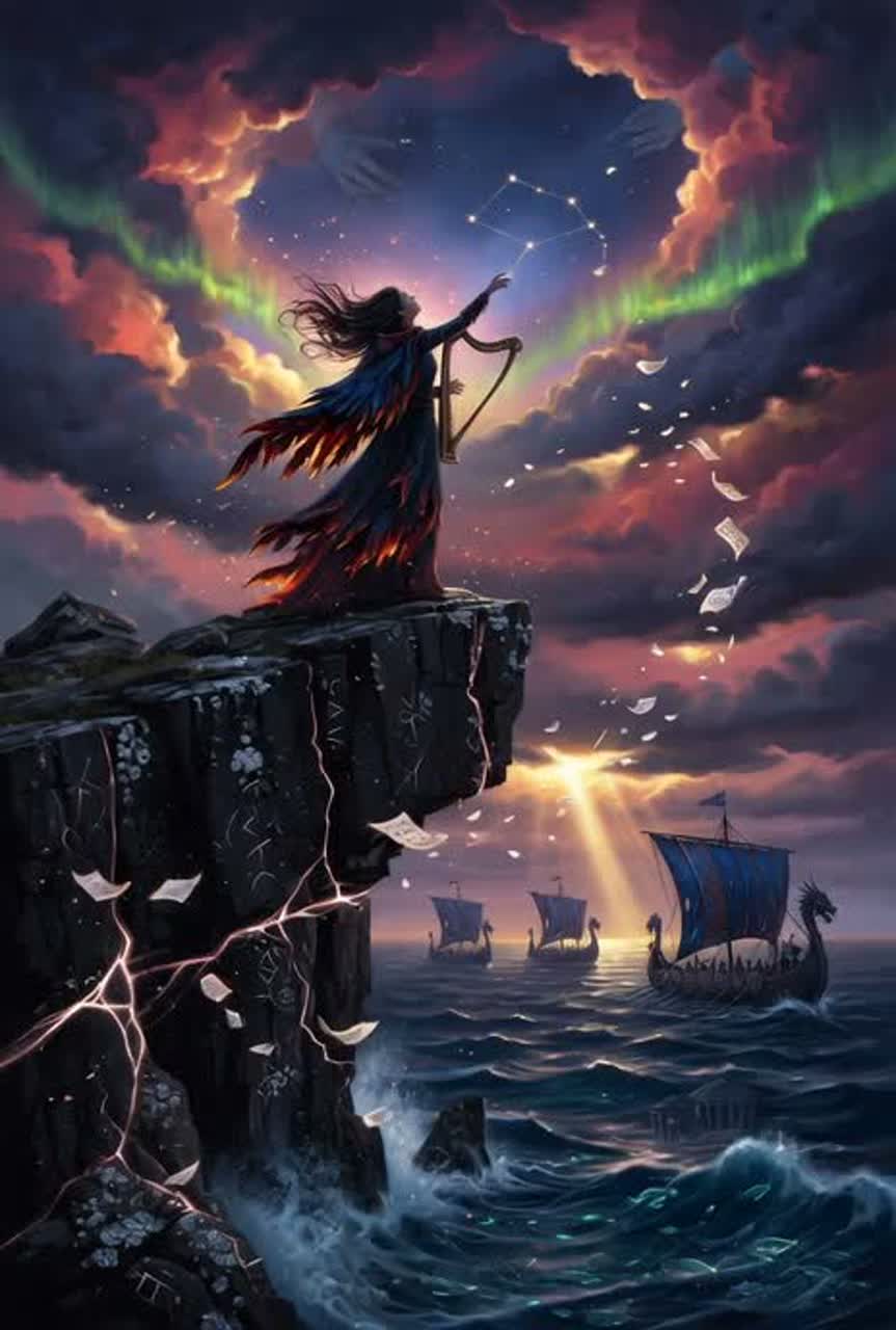 [Instruments: Bowed and plucked golden harp with delay/reverb, orchestral cello/violin swells, vellum rustle and star-static, sub-bass sea rumble, wave-crash frame drum, distant low Viking horn echoes, wind-chime glissandi], ‑pop hooks, ‑EDM drops, ‑heavy distortion metal, ‑generic ballad piano, ‑rap flows, ‑jazz improvisation, ‑country twang, ‑upbeat dance