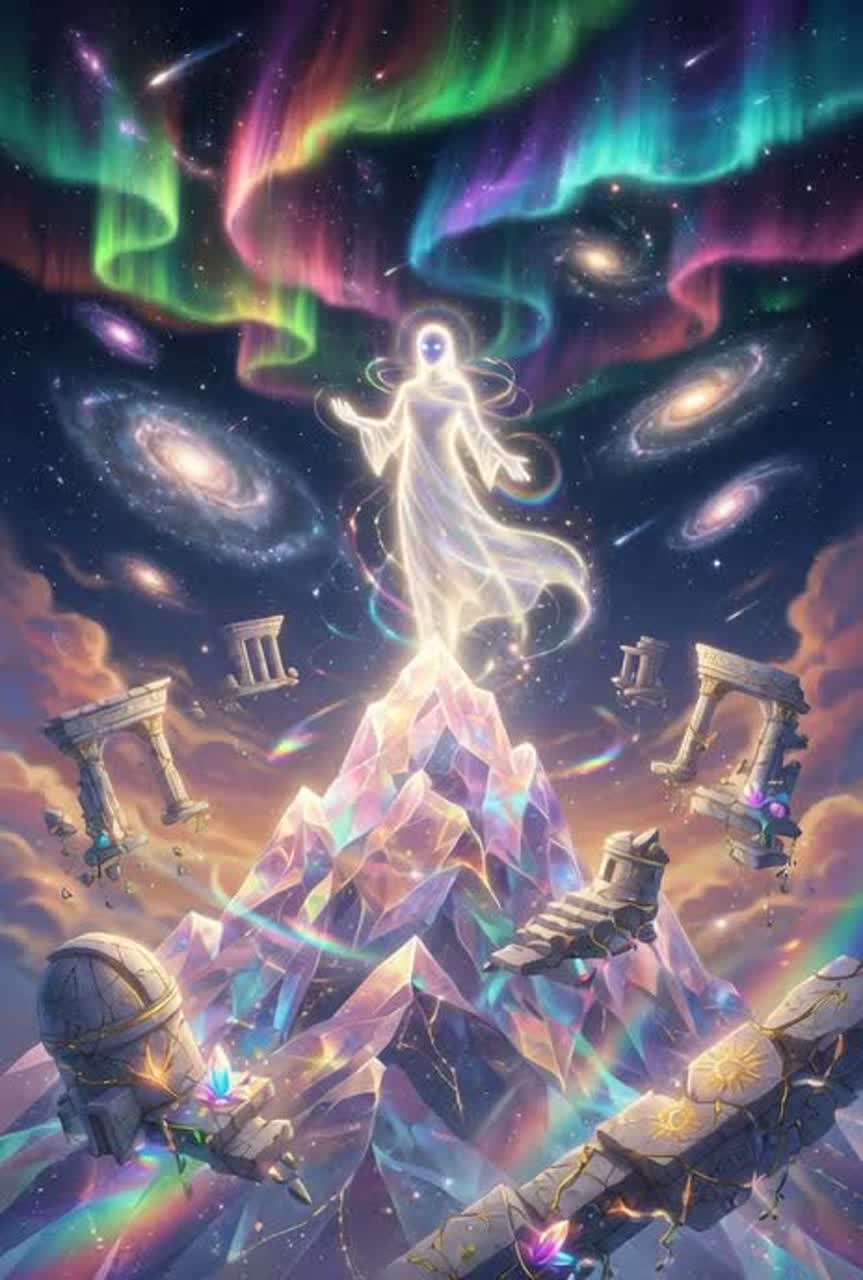 [Style: Vast, textural ascension with dynamic fractures; organic decay yielding to prismatic digital luminescence]