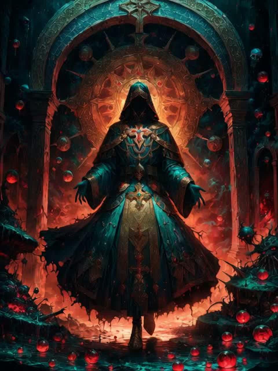[Instrumentation: Pipe organ drones and sweeping orchestral strings for sacred weight, thunderous percussion and distorted guitars for the fiery abyss, ethereal pulsing synths and crystalline chimes evoking the floating orbs, subtle brass stabs and low throat-sung undertones for primal depth, ]