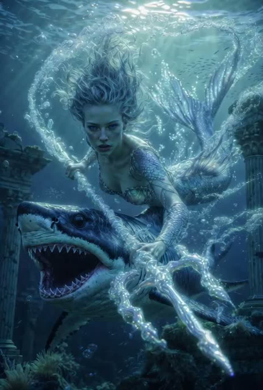 [Instrumentation: Sub-bass drones and processed whale-song for crushing depth; shimmering crystal synths and ancient harp glissandos for scale shimmer and bubbles; heavy reverb-drenched distorted guitars for shark-thrashing power; tribal percussion mutating into thunderous metal kicks; sonar pings as razor melodic hooks; distant bouzouki laments for lost Atlantis soul, ]