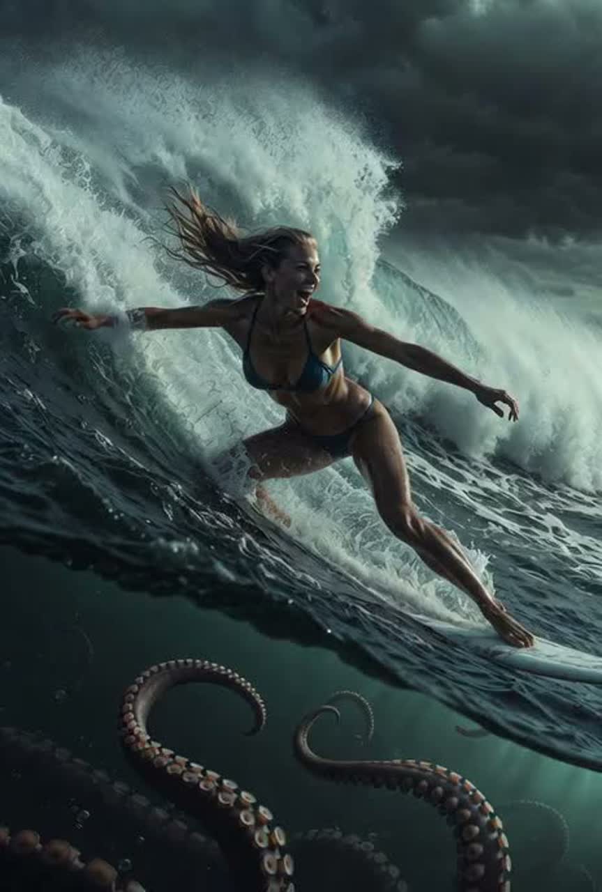 [Style: Adrenaline-fueled cinematic fusion with volatile wave-like builds, sudden chaotic drops evoking tentacle strikes, and an unexpected surf-rock twist on traditional metal aggression for a uniquely joyful yet perilous Valkyrie vibe, ]