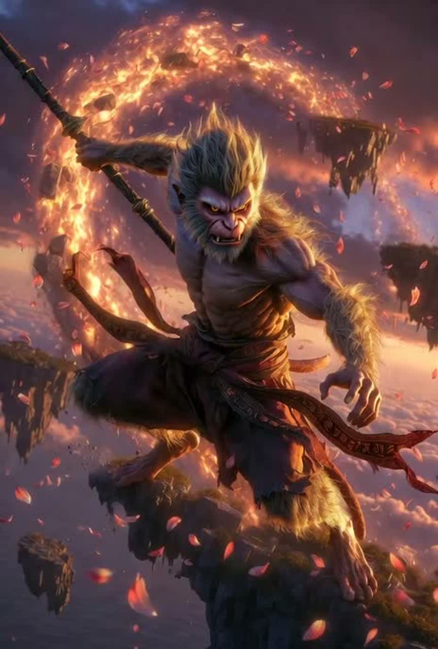 [Instrumentation: Traditional pipa and erhu slicing through crushing distorted guitars, powerful taiko war drums, dizi flute cries, symphonic strings and brass, deep booming Ruyi Jingu Bang impact sounds, glitchy electronic transformation effects, thunderous bass, and massive choir layers, ]