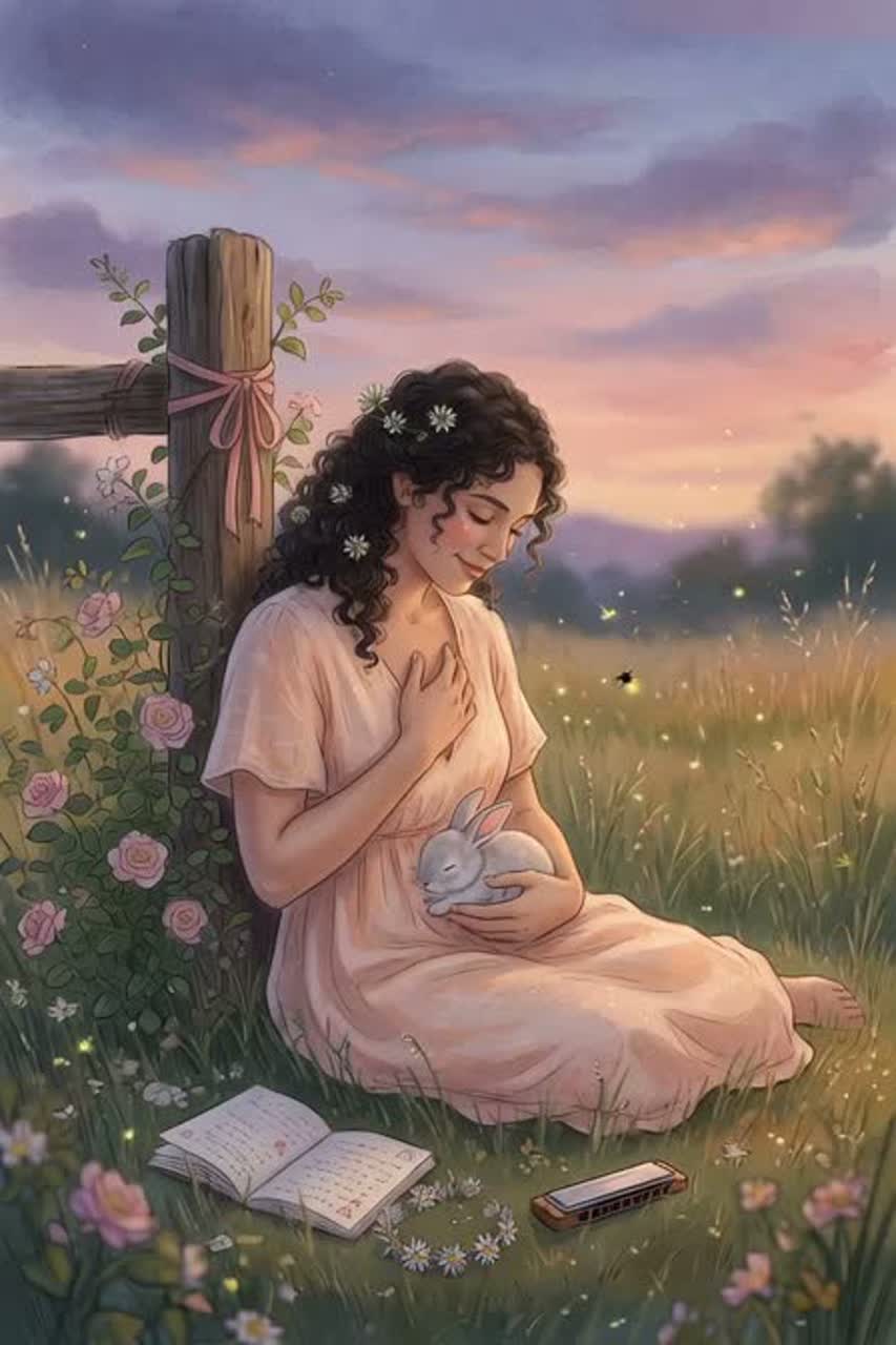 [Instruments: Fingerpicked acoustic guitar (warm, resonant mahogany tone), breathy diatonic harmonica as melodic storyteller, delicate music-box celeste arpeggios and glass harp twinkles, soft sub-pulse percussion mimicking heartbeat (low toms and synth warmth), faint field-recorded meadow rustles and grass whispers], ‑Driving rock rhythms, ‑electronic drops or synth leads, ‑aggressive vocals or distortion, ‑fast tempos or dance beats, ‑polished auto-tuned perfection, ‑heavy orchestral swells or cinematic bombast