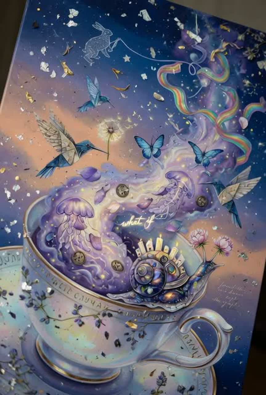 Instruments: "Delicate harp and antique felt piano for porcelain rim intimacy, swelling string quartet mimicking violet liquid flow, celesta and glockenspiel scattering gold-flake sparkles, wavy analog synths for jellyfish drift, subtle glitch percussion ticking like turning gears, unexpected harpsichord interlude, soft frame-drum pulses and distant teacup clinks", ‑upbeat pop, ‑rock guitars, ‑heavy EDM drops, ‑generic folk strumming, ‑polished auto-tune perfection